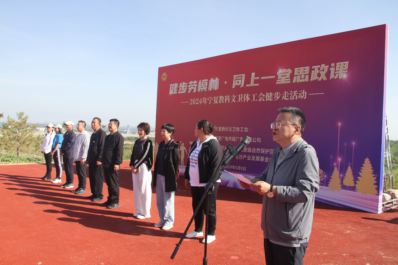 上午9时,自治区教科文卫体工会系统的400多名职工齐聚白芨滩林场中心广场,自治区教科文卫体工会主席朱伟主持开幕式,白芨滩林场讲解员吴晓琴现场为大家讲授了白芨滩防沙林场的治沙经验和全国劳模王有德同志的先进事迹。自治区总工会副主席戴良宗宣布健步走活动正式开始。