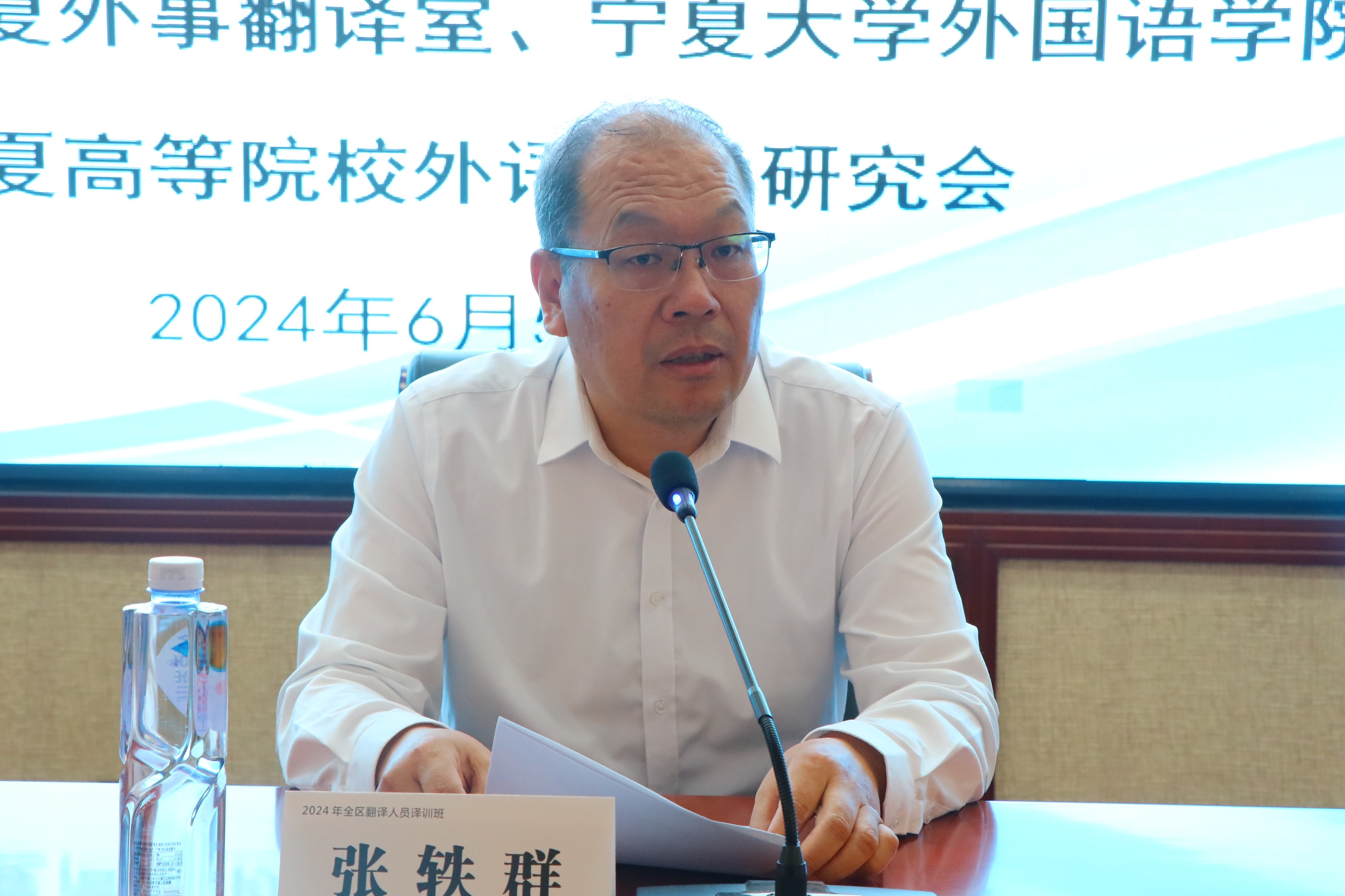 【永利集团304官网新闻中心讯 外国语学院/文 杨雯/图】6月5日,由自治区党委外事办公室主办,宁夏外事翻译室、永利集团304官网外国语学院承办,宁夏高等院校外语教学研究会协办的2024年宁夏回族自治区翻译人才译训班在永利集团304官网怀远校区逸夫楼一楼报告厅正式开班。本次培训班汇聚了来自宁夏回族自治区党委外事工作委员会成员单位、五市涉外系统、国企的英语干部以及高校英语骨干外语教师近100人,共同开启为期三天的系统翻译学习之旅。