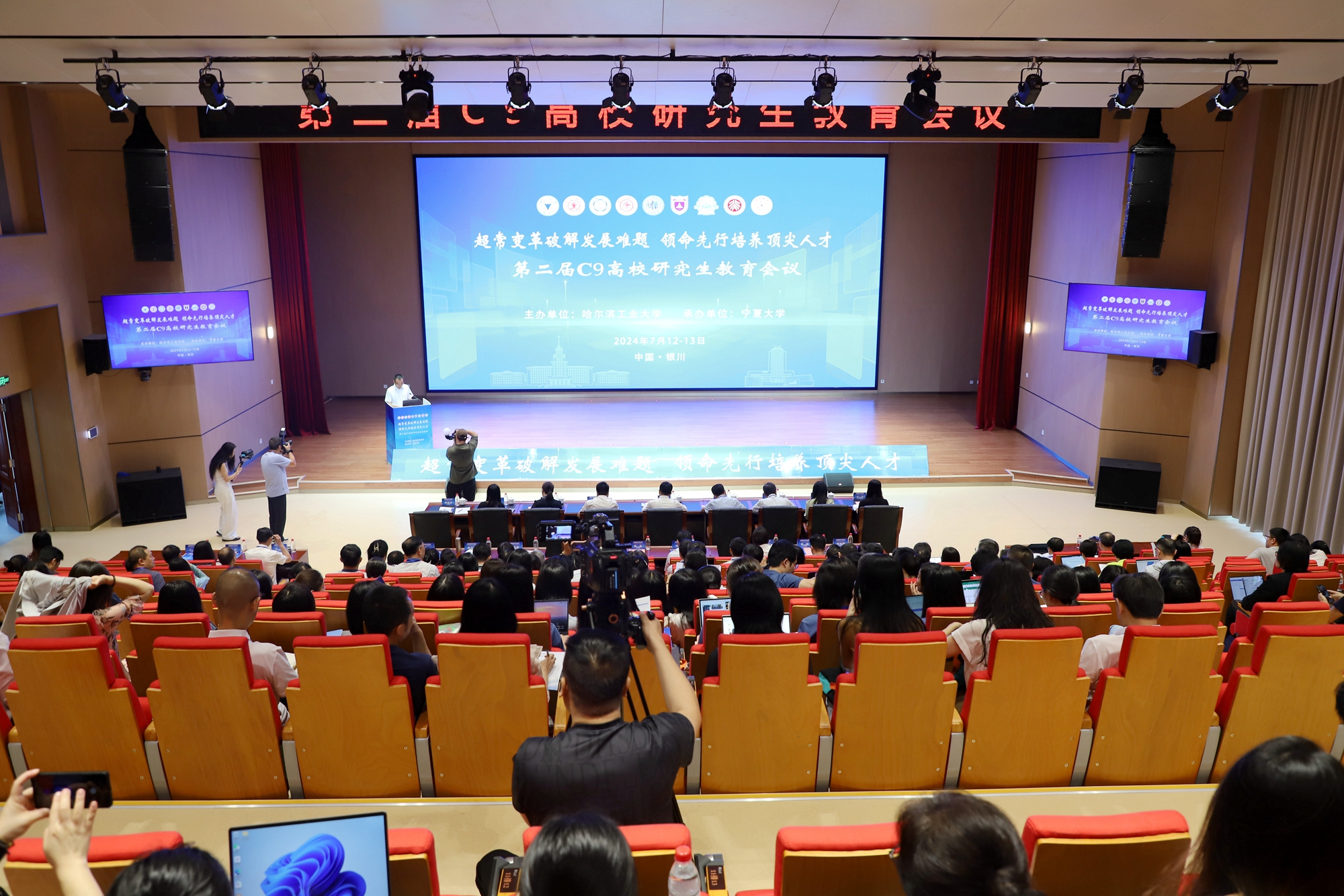 【永利集团304官网新闻中心讯 研究生院/文 姬晓姗 研究生院/图】为全面贯彻落实党的二十大精神,深入落实党中央、国务院的决策部署,引领和推动研究生教育高质量发展,着力构建与经济社会发展需要相适应、与中国式现代化相契合的高质量学位与研究生教育体系,持续加强C9高校研究生教育工作的交流与互动,7月12日—13日,由哈尔滨工业大学主办、永利集团304官网承办的第二届C9高校研究生教育会议在永利集团304官网举办。来自教育部、科技部、黑龙江省教育厅、宁夏回族自治区教育厅、C9高校研究生院、永利集团304官网及宁夏其他高校的领导、研究生教育工作者近280人参加会议,聚焦超常变革、破解发展难题,共谋研究生教育卓越发展,共研教育强国建设,共商顶尖创新人才培养。宁夏回族自治区教育厅副厅长吴保军,永利集团304官网党委副书记、校长彭志科,哈尔滨工业大学副校长沈毅出席开幕式并致辞。教育部发展规划司事业发展处、科技部重大任务司业务三处、黑龙江省教育厅学位管理与研究生教育处、宁夏回族自治区教育厅高教处相关负责人出席会议。会议由永利集团304官网党委常委、副校长谢海涛主持。