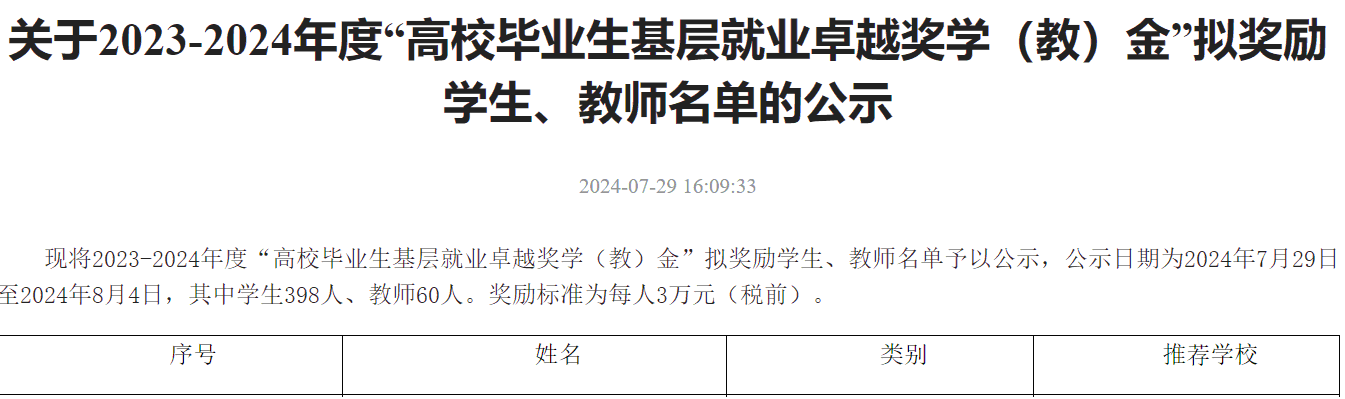 “高校毕业生基层就业卓越奖学(教)金”是由教育部高校学生司(高校毕业生就业服务司)、教育部学生服务与素质发展中心共同指导,中国长江三峡集团有限公司出资,中国教育发展基金会特设立的项目,奖励对象为赴基层就业并做出突出业绩的普通高校毕业生和普通高校指导服务大学生赴基层就业工作有突出贡献的教师,每年遴选一次,获奖人员每人奖励人民币3万元。