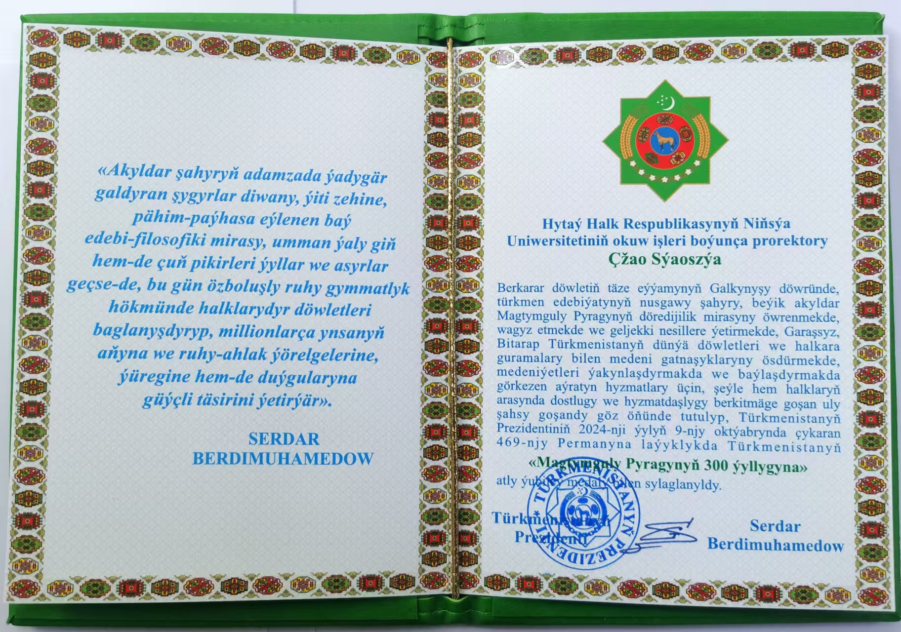 授奖仪式在土库曼斯坦国立马赫图姆库里大学举行,土库曼斯坦国民会议主席古尔马诺娃为赵晓佳颁发奖章。马赫图姆库里·斐拉格(1724-1807)是土库曼斯坦杰出的思想家和诗人,土库曼民族语言和文化的奠基人,其手稿被联合国教科文组织列入《世界记忆名录》。“马赫图姆库里·斐拉格”奖章是土库曼斯坦为表彰在研究马赫图姆库里·斐拉格文化遗产方面作出重要贡献的各国人士所设立,由土库曼斯坦总统签署命令进行表彰,本次获此殊荣的外籍人士共29人。