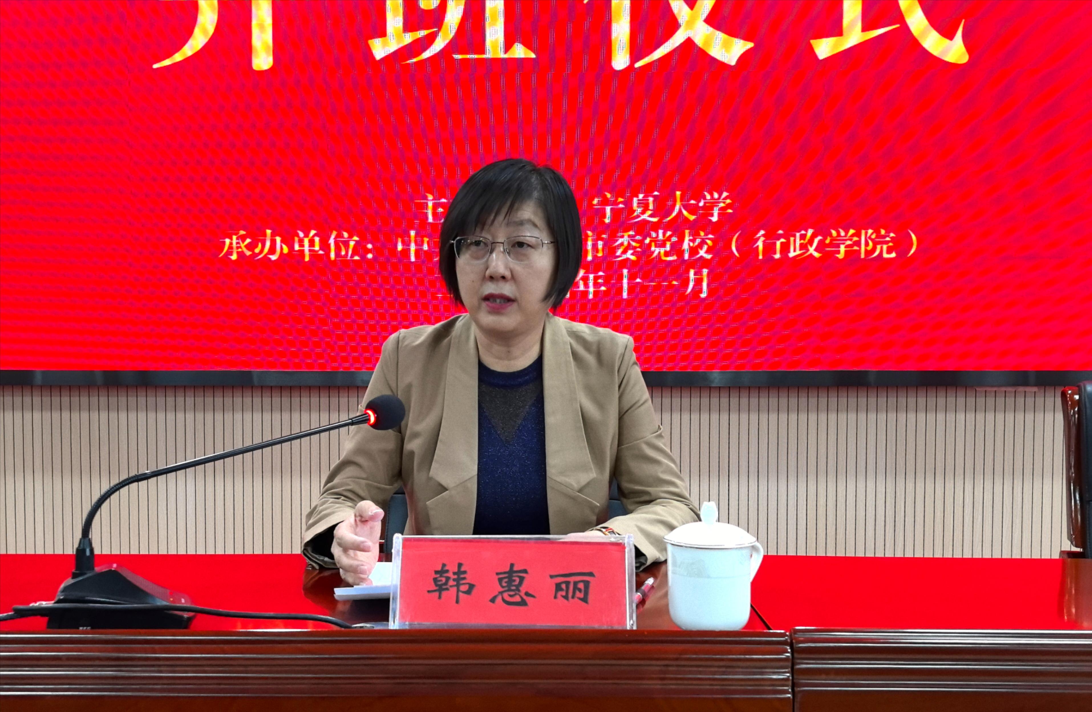 校党委副书记韩惠丽在开班式上作动员讲话。她代表学校党委对承办本次培训的石嘴山市委党校(石嘴山市行政学院)表示衷心感谢,并对参训学员提出具体学习要求。她表示,高校作为国家意识形态安全建设的重要阵地,肩负着育新人、兴文化的时代使命。在集中精力做好中心工作的同时,不能放松和削弱意识形态工作。她要求参训学员结合本次学习培训,坚持守正创新,时刻绷紧意识形态安全之弦;知行合一,切实提高意识形态工作本领;提高站位,自觉增强参训责任感使命感;珍惜机会,严格遵守培训纪律,确保学习培训取得丰硕成果。