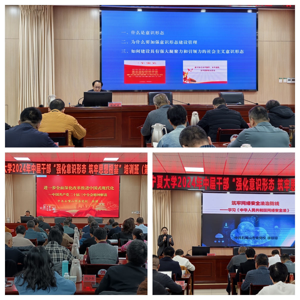 本次培训由校党委组织部、宣传部与石嘴山市委党校共同商定教学方案,设计培训课程并具体实施。培训内容侧重于中层干部政治能力及意识形态、新闻宣传、安全保密等工作能力提升,对党的二十届三中全会精神、习近平总书记考察宁夏重要讲话精神、马克思主义民族宗教观、筑牢网络安全法治防线等内容安排了专题学习,就做好新时代意识形态工作和如何用好新闻媒介提高高校宣传工作质量作了专题交流和研讨,并对学校公众号运营侵权案例从法律方面作了分析与解读。同时,培训还通过丰富的主题党课、情景教学等形式,提升学员的理论功底、业务水平和媒体素养。