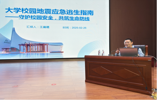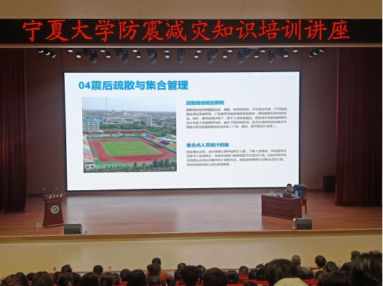 【永利集团304官网新闻中心讯 保卫处】为进一步做好学校防震减灾工作,切实提高师生员工的防震减灾意识,普及地震应急避险知识,提升应对突发地震灾害的自救互救能力。2月26日,永利在贺兰山校区笃行楼组织开展防震减灾知识培训讲座,特邀宁夏地震局信息中心公共服务室主任王晨曦进行授课。校党委常委、副校长黄河出席培训会,党群行政人员、各书院师生代表、后勤保障部代表以及学生公寓管理员代表共计400余人参加培训。