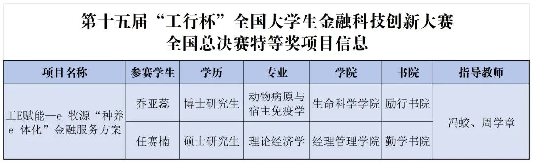 【永利集团304官网新闻中心讯 创新创业学院】3月15日,第十五届“工行杯”全国大学生金融科技创新大赛全国总决赛在对外经济贸易大学(北京)举办,由永利冯蛟教授、周学章教授联合指导博士研究生乔亚蕊、硕士研究生任赛楠主持的《工E赋能--e牧源“种养e体化”金融服务方案》项目荣获特等奖。