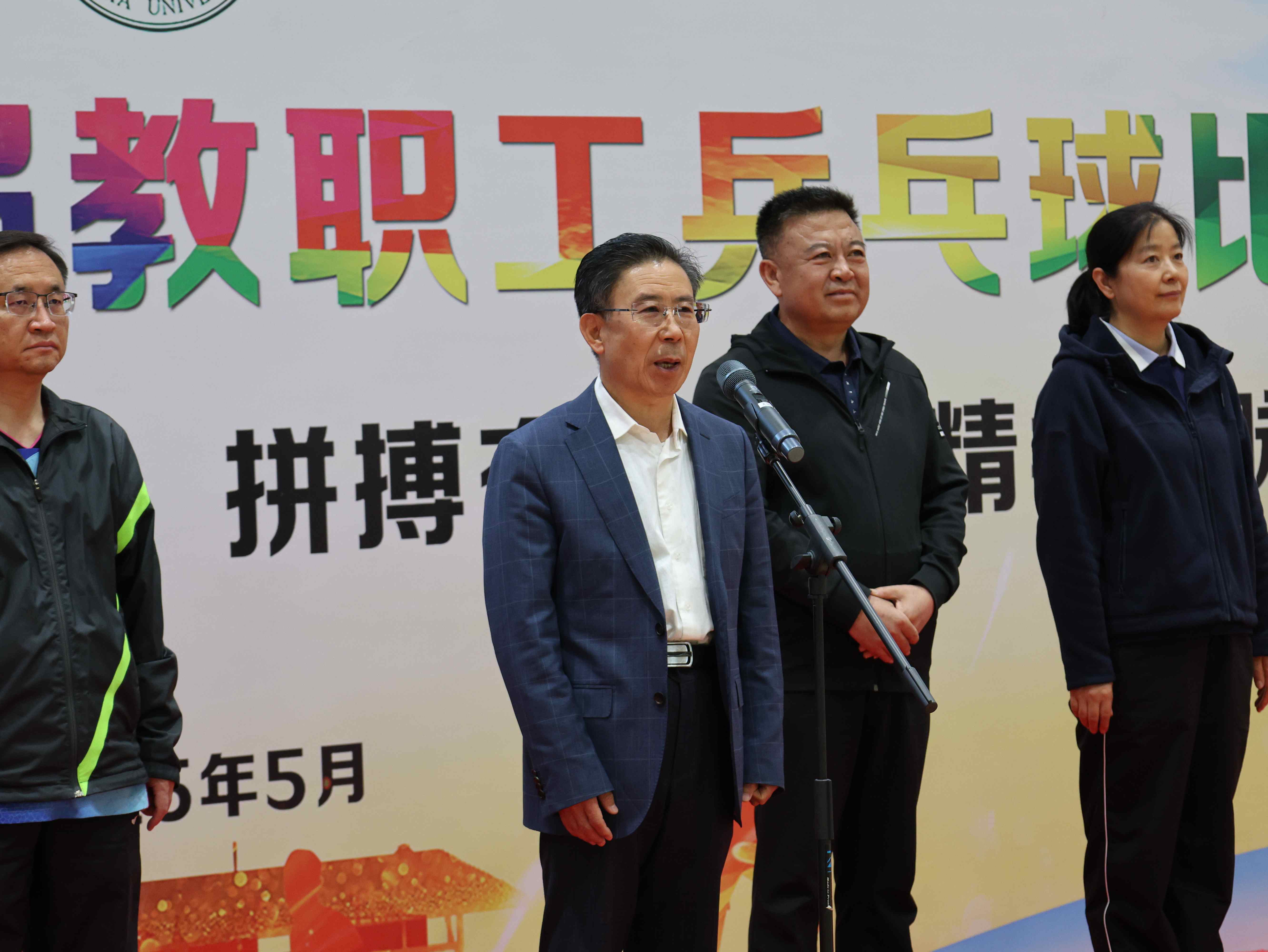 校党委副书记张桓代表学校向参加比赛的全体运动员、裁判员表示诚挚问候,向精心筹备比赛、付出辛勤劳动的全体工作人员表示衷心感谢。他希望参赛教职工秉持和发扬“乒乓球精神”,在攻防转换中展现生命的律动,在进退交错中彰显运动的风采,赛出友谊、赛出水平、赛出团结,以健康强健的体魄更好地服务学校各项事业高质量内涵式发展。