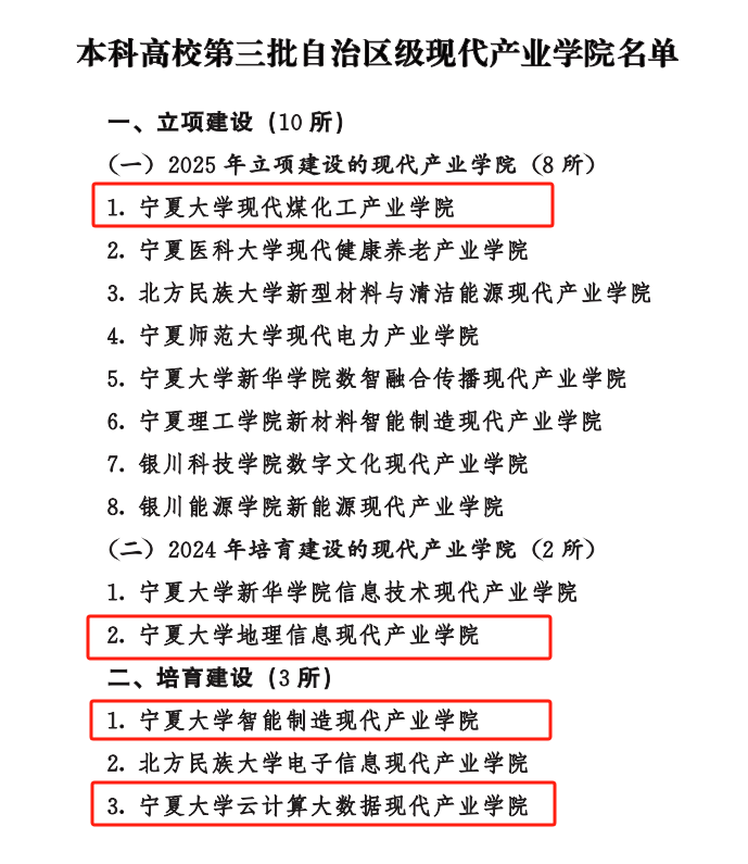 【永利集团304官网新闻中心讯 本科生院】近日,自治区教育厅、发展和改革委员会、工业和信息化厅联合公布本科高校第三批自治区级现代产业学院建设名单,永利四所现代产业学院成功入选。其中,地理信息、现代煤化工获批自治区级现代产业学院,智能制造、云计算大数据获批自治区重点培育现代产业学院。截至目前,永利挂牌成立的9个现代产业学院,荣获自治区立项建设达到8个,占比88.9%,标志着永利在深化产教融合、服务自治区经济发展和产业升级方面实现新突破。