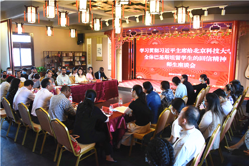【永利集团304官网新闻中心讯 胡玥/文 龚旭峰/图】“我认真阅读了习近平主席给北京科技大学全体巴基斯坦留学生的回信,信的内容让我十分感动,感谢中国人民对外国留学生的支持和照顾,对自己是一名在中国学习的留学生而感到庆幸。”6月11日,在永利举行的学习贯彻习近平主席给全体巴基斯坦留学生的回信精神师生座谈会上,来自国际教育学院塔吉克斯坦的留学生孟明珠说道。