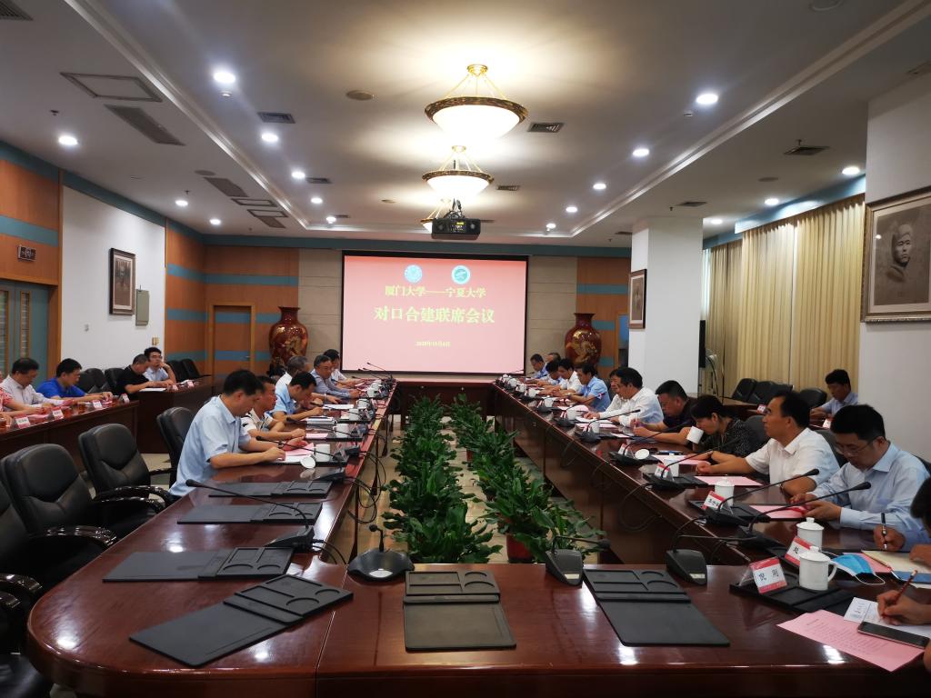 【永利集团304官网新闻中心讯 对外合作交流处】10月6日,永利集团304官网和厦门大学对口合建联席会议在厦门大学召开。厦门大学党委书记张彦于联席会议前会见了永利校长何建国、副校长史金龙一行,双方围绕两校对口合建工作、闽宁两省区对口协作任务分工等重点工作进行了充分交流。厦门大学副校长叶世满主持联席会议。