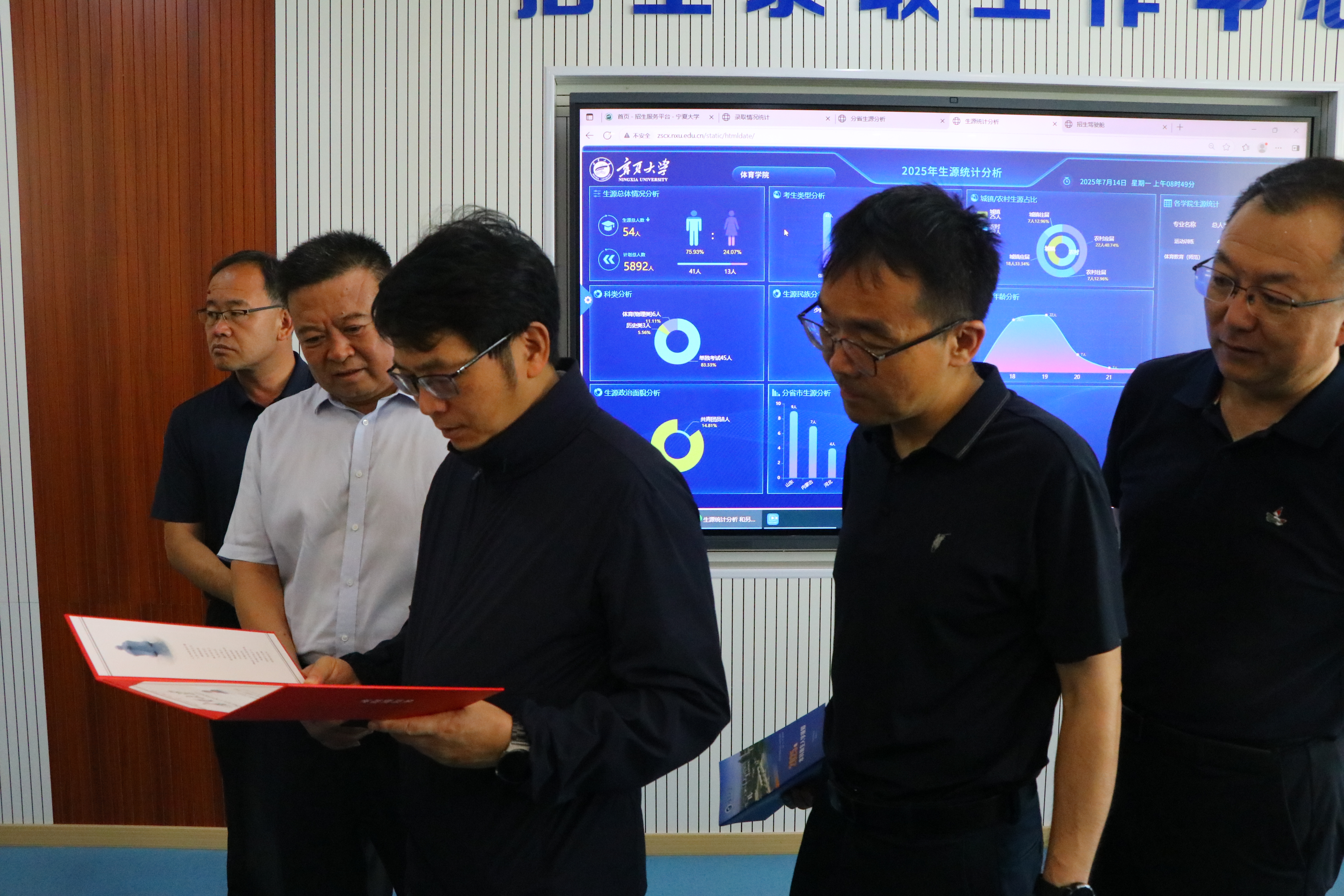 【永利集团304官网新闻中心讯 冯禹君/文 王晓东/图】为确保招生录取工作安全、高效、有序进行,在永利2025年本科生招生录取工作紧锣密鼓地进行之际,7月14日,校领导彭志科、张桓、谢海涛一行前往贺兰山校区文荟楼2025年本科招生录取现场调研指导工作,并慰问工作人员。