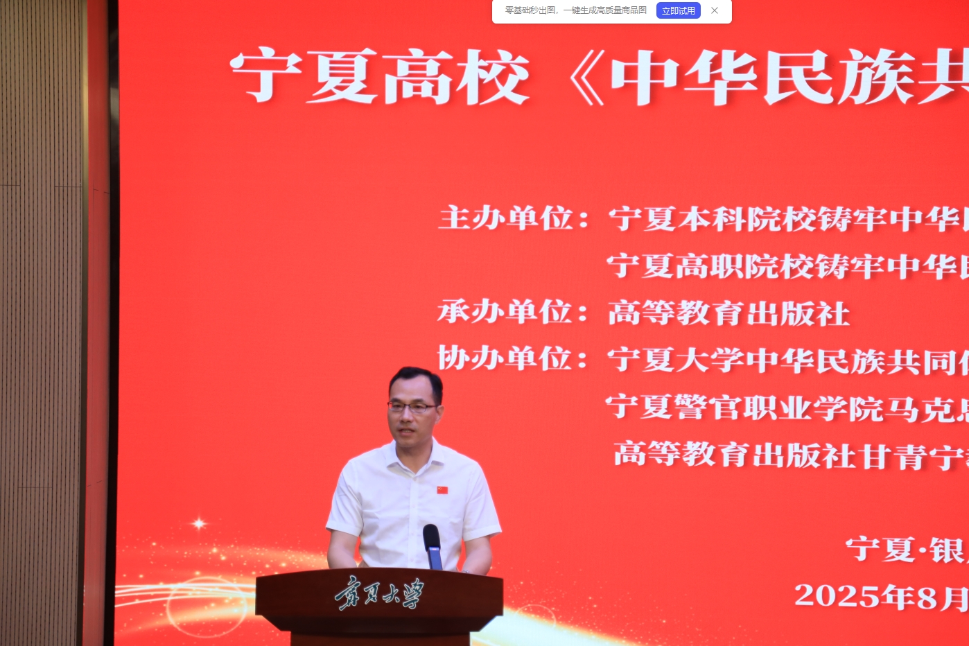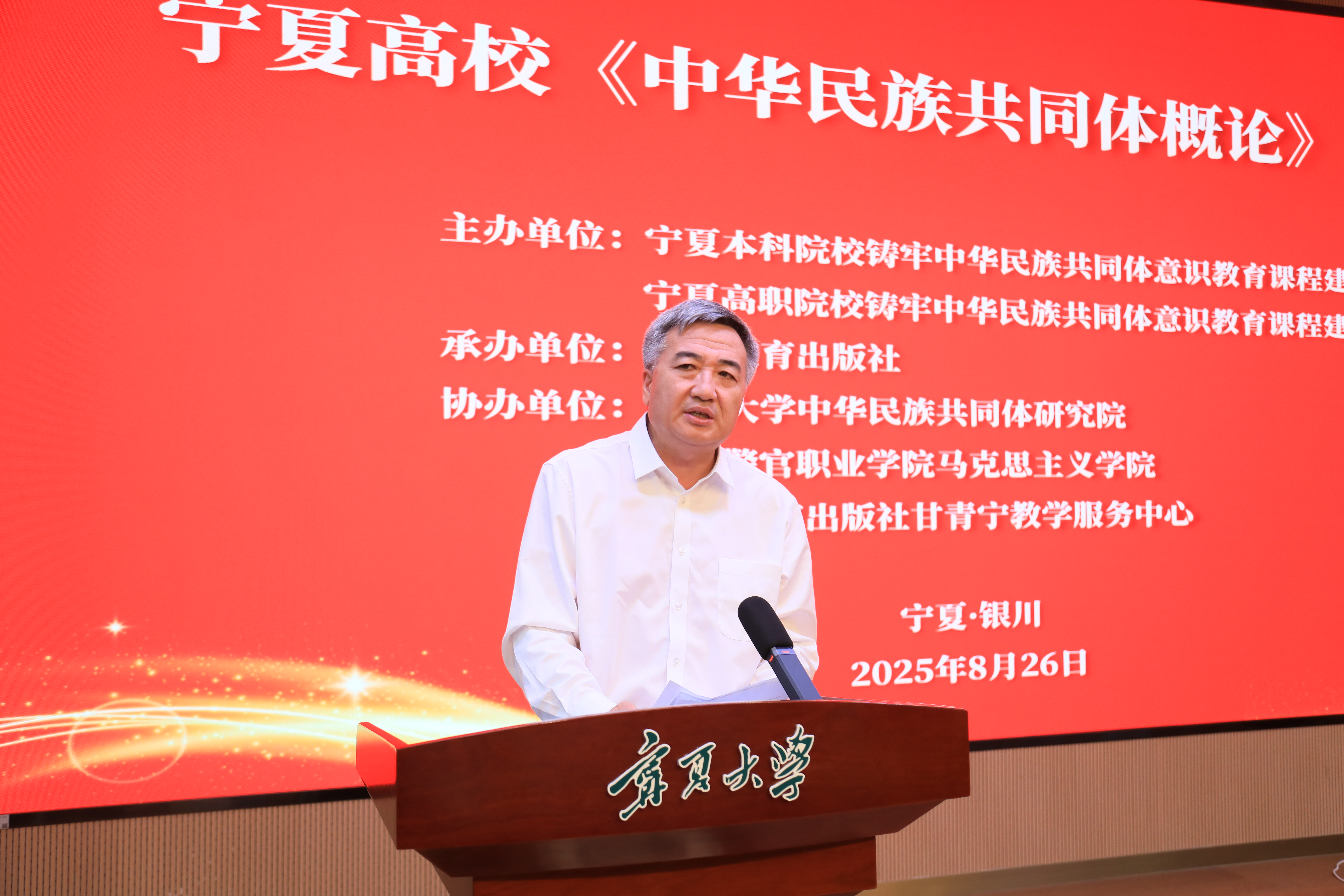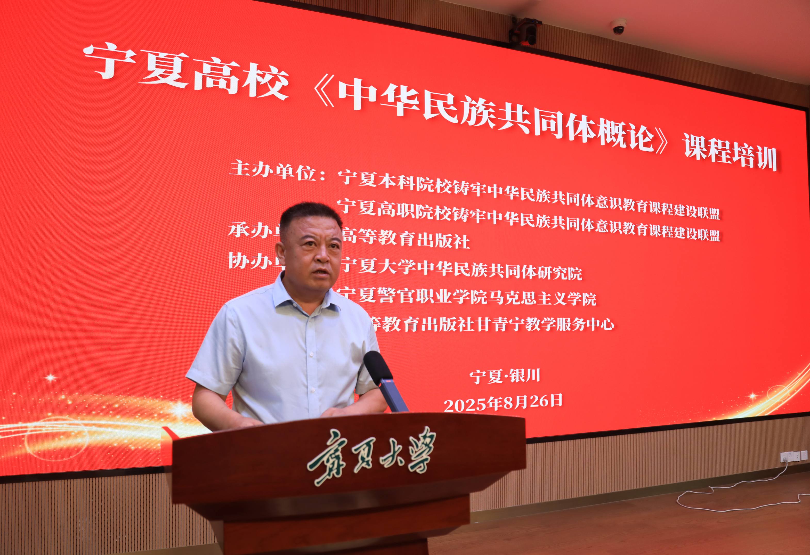 【永利集团304官网新闻中心讯 党委统战部】8月26日,宁夏高校《中华民族共同体概论》课程培训在永利集团304官网举办。此次培训由宁夏本科和高职院校铸牢中华民族共同体意识教育课程建设联盟主办,高等教育出版社承办,永利集团304官网中华民族共同体研究院、宁夏警官职业学院、高等教育出版社甘青宁教学服务中心协办,来自全区8所本科高校与14所职业院校的120余位一线教师及课程负责人参加培训。永利集团304官网党委常委、统战部部长朱学军主持开班仪式。