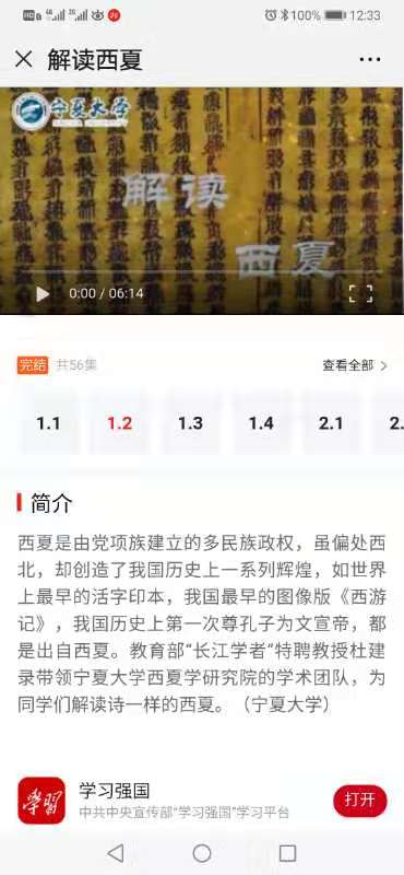 据悉,《解读西夏》课程由杜建录教授领衔讲授,团队成员均为具有博士学位的中青年学术骨干。课程总共11讲,分别从党项崛起与西夏建国、西夏自然环境与社会生产、西夏文化、西夏王族和后族、西夏的军种与战术、西夏文字的创制和使用、西夏绘画艺术、我国最早的活字印本、贺兰山下古塚稠、西夏遗民在何方、百年西夏学的形成与发展等专题,讲授西夏的建立、发展和消亡,阐释以党项为代表的北方游牧文化和以汉族为代表的中原农耕文化长期交往交流交融,形成你中有我,我中有你,最终完全融合到中原文明中,揭示出中华文明的凝聚力和向心力。2018年12月以来,《解读西夏》先后在“学堂在线”和“爱课堂”上线,目前选课人数已累积达到1万余人,涵盖34个省、自治区、直辖市和特别行政区。入选学习强国”平台后,将有更多听众。