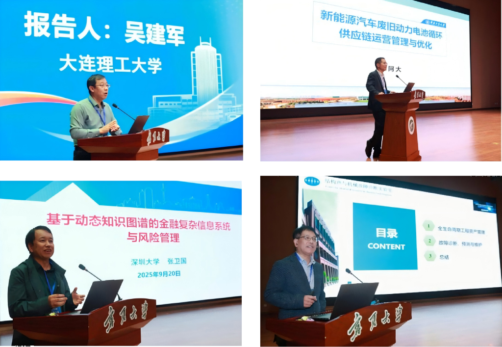 会议期间,基金委管理科学部刘作仪研究员、大连理工大学吴建军教授、西北工业大学车阿大教授、深圳大学张卫国教授、青岛理工大学林天然教授、天津大学王鑫教授、清华大学岳小伟副教授、上海大学翟庆庆副教授、永利集团304官网赵军教授分别就基金委管理科学部的资助动态、低空运行管理、废旧动力电池循环供应链运营管理、金融复杂信息系统与风险管理、机械装备健康监测诊断与工程资产管理、知识图谱新技术、飞机质量工程、可靠性数据建模分析、大模型驱动的企业演化计算实验等领域分享了前沿科研成果。