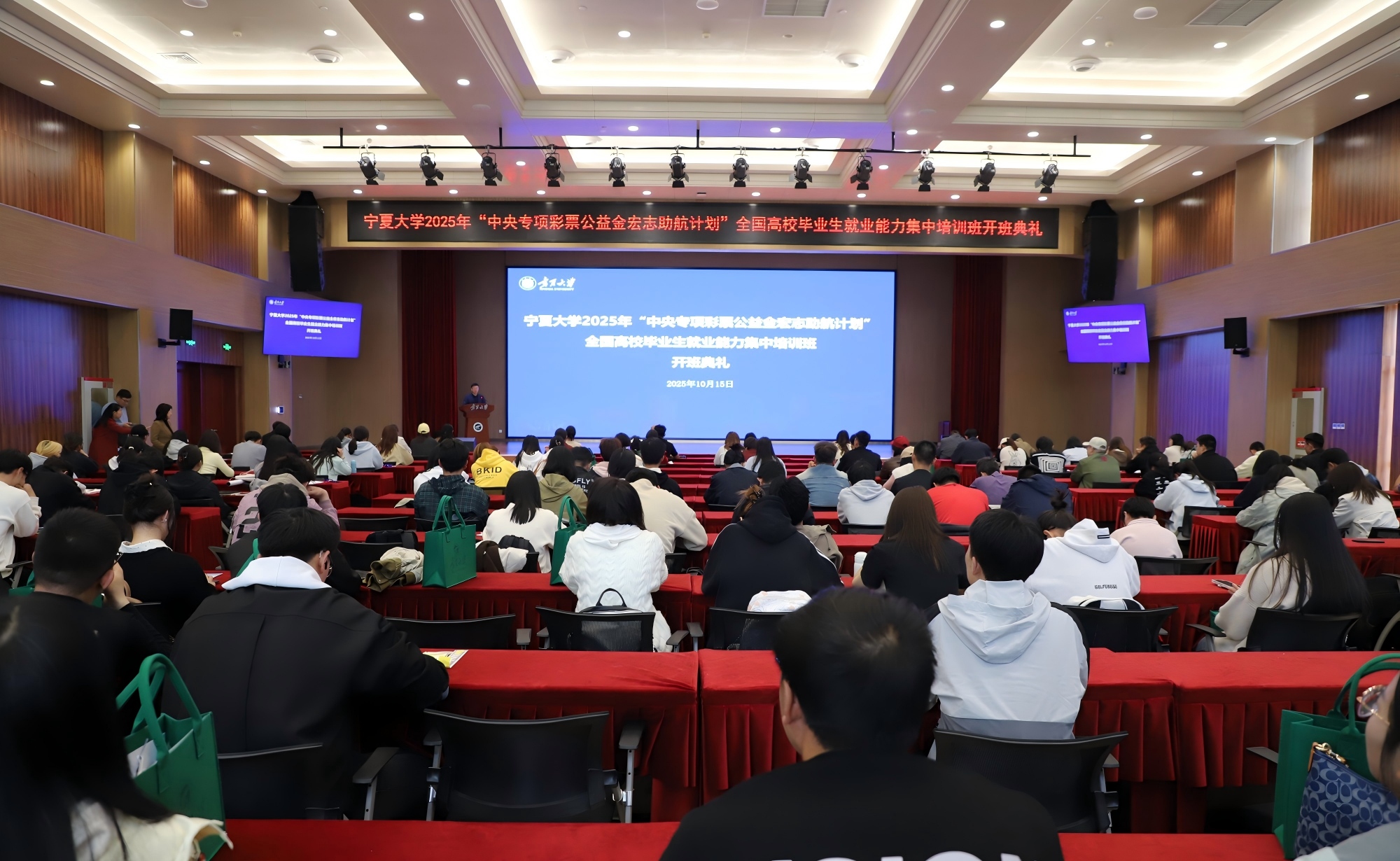 【永利集团304官网新闻中心讯 姬晓姗 文/图】为贯彻落实党中央、国务院决策部署,强化困难群体高校毕业生就业精准帮扶,帮助学生提升综合素质和就业能力,促进高质量充分就业,10月15日,2025年“中央专项彩票公益金宏志助航计划”毕业生就业能力培训班开班仪式在永利贺兰山校区笃行楼三楼报告厅举行。校党委常委、副校长黄河参加开班仪式。