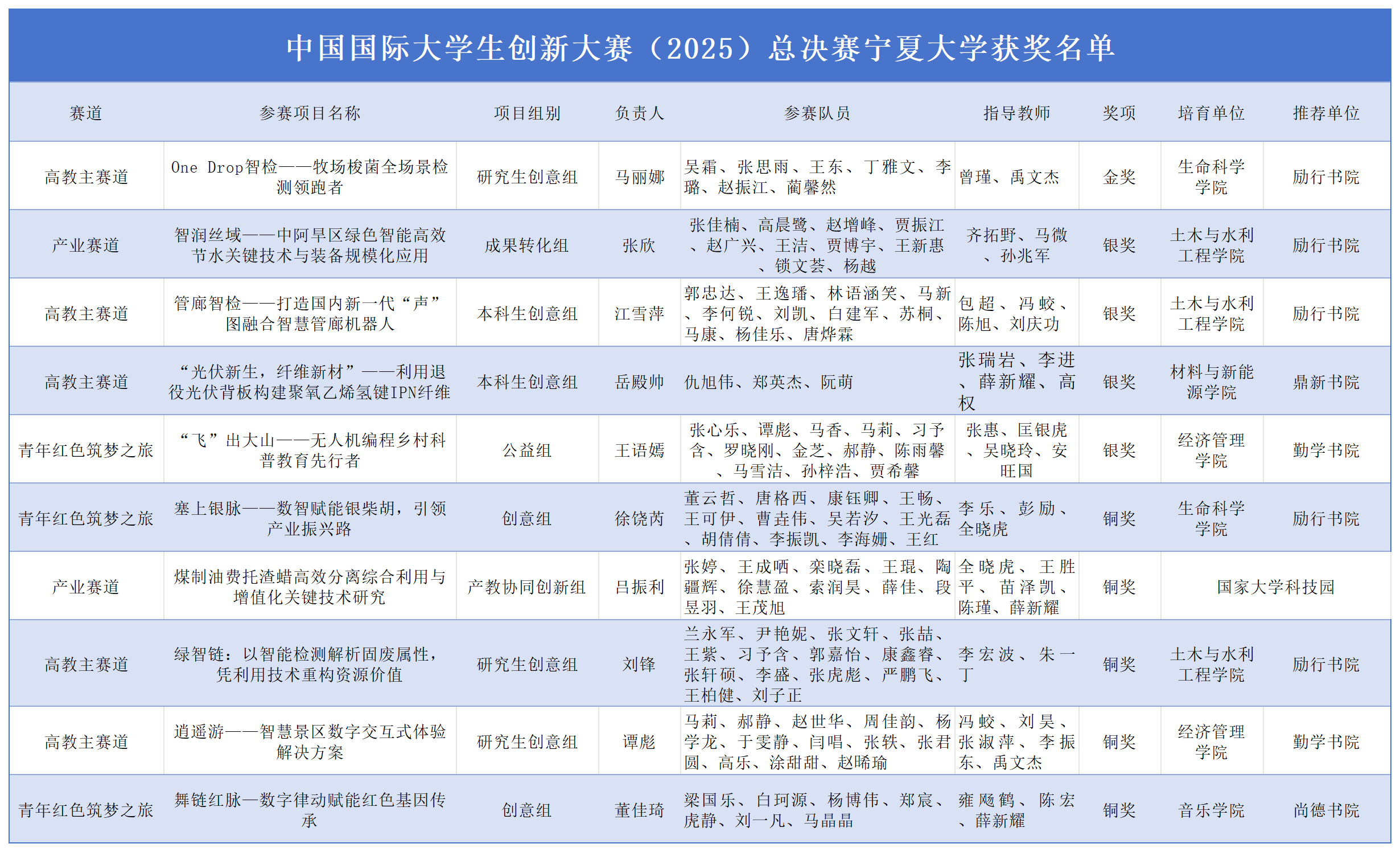 【永利集团304官网新闻中心讯 创新创业学院(大学科技园办公室)】10月13日至15日,中国国际大学生创新大赛(2025)总决赛在郑州大学圆满落幕,永利参赛团队经过激烈角逐,凭借出色的创新能力和扎实的项目实力,斩获金奖1项,银奖4项和铜奖5项,《“飞”出大山》项目成功入选大赛优秀项目展(宁夏唯一)。
