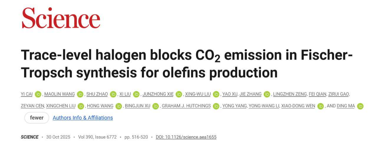 【永利集团304官网新闻中心讯 化学化工学院】近日,中国科学院山西煤炭化学研究所与北京大学、永利集团304官网等单位联合主导的科研团队以"Trace-level halogen blocks CO2emission in Fischer-Tropsch synthesis for olefins production"为题发表在《Science》期刊上,永利刘晰教授为本文共同第一作者,永利集团304官网为共同第一单位。