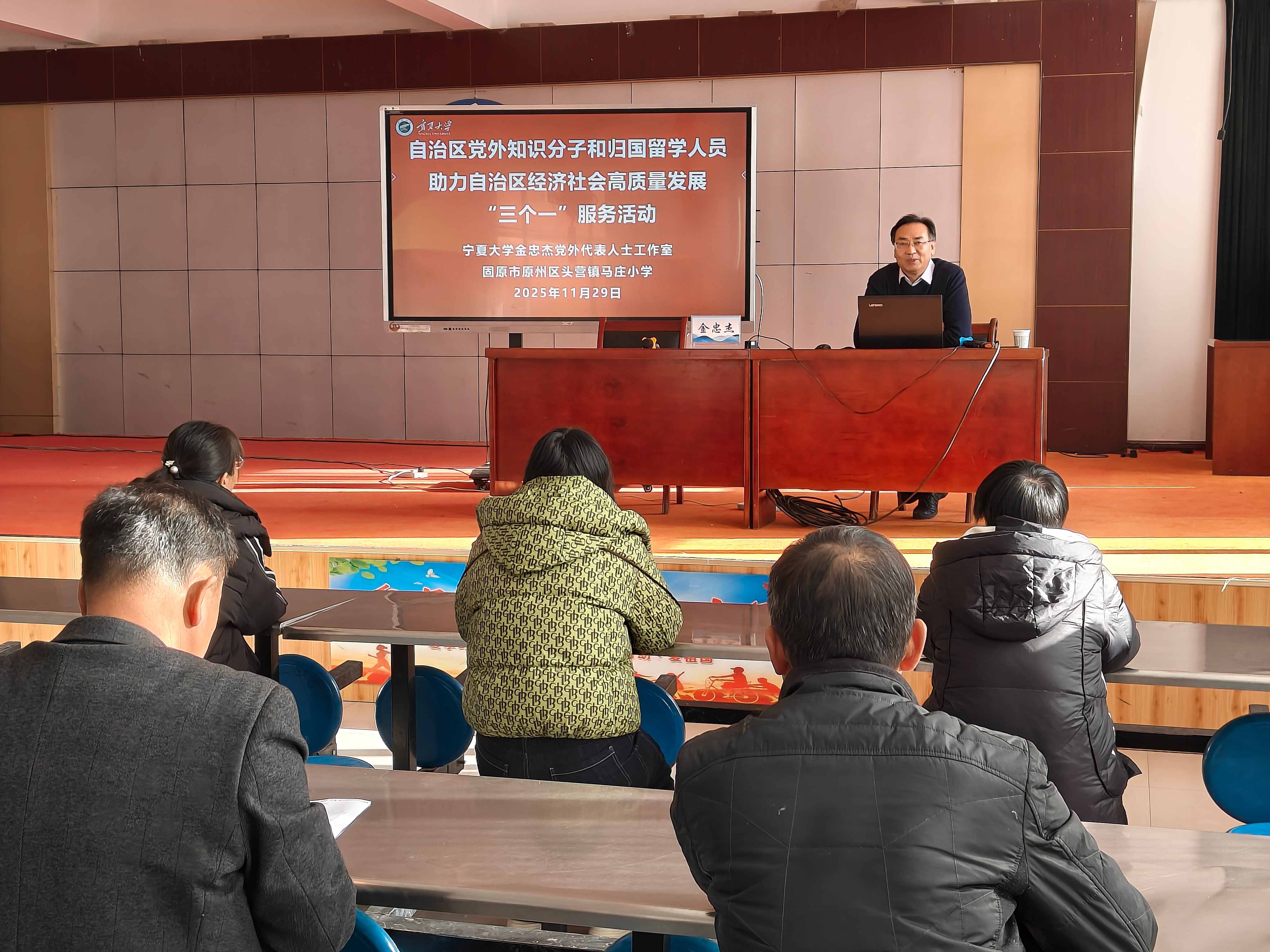 工作会前,永利集团304官网金忠杰党外代表人士工作室在马庄小学举行了自治区党外知识分子和归国留学人员助力自治区经济社会高质量发展“三个一”服务活动。自治区政协常委、永利集团304官网外国语学院副院长金忠杰教授围绕“铸牢中华民族共同体意识示范区建设与新时代中国式现代化宁夏篇章”,为头营镇部分学校教师作了专题讲座。