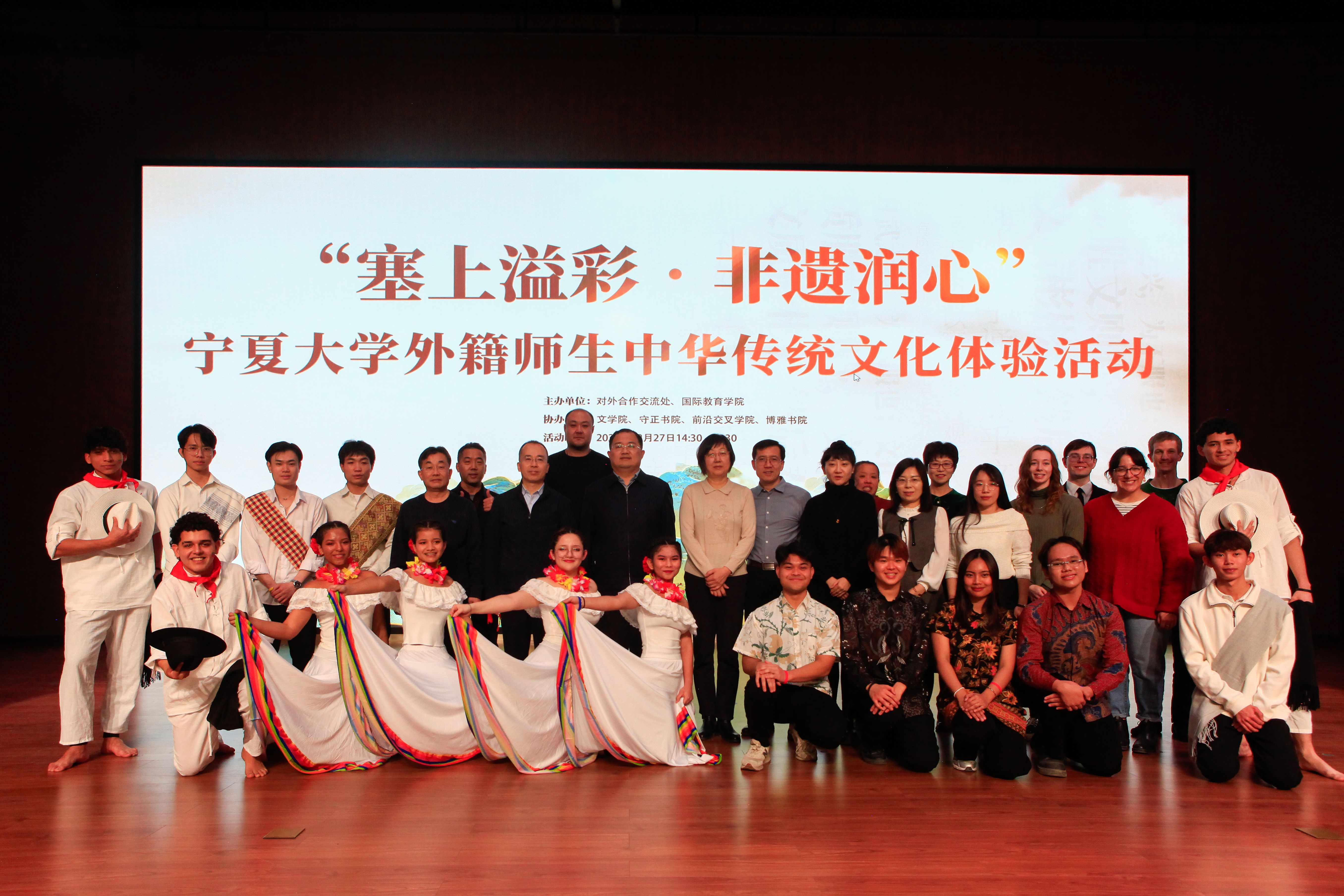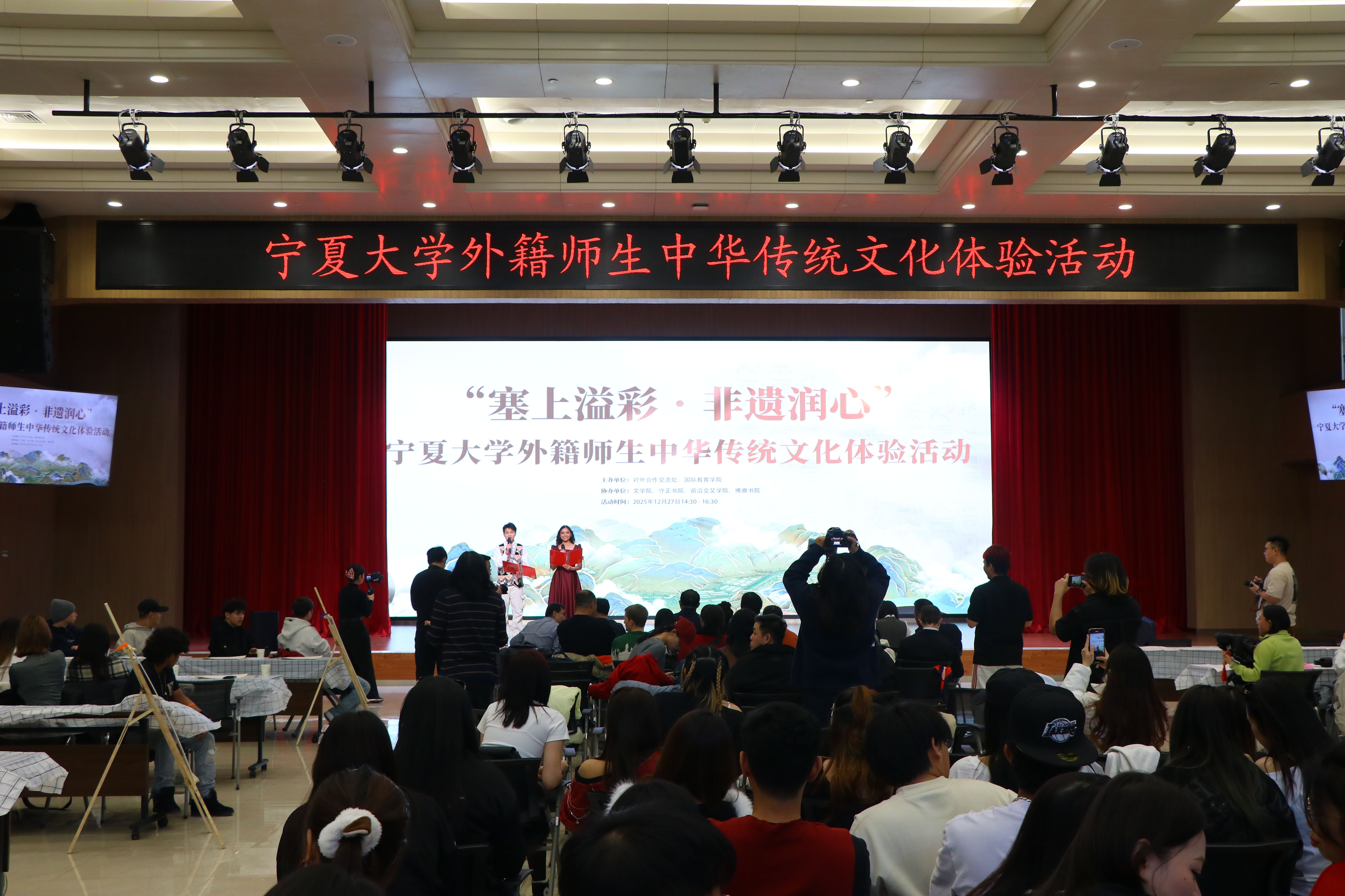 【永利集团304官网新闻中心讯 杨雯/文 杨雯 学生记者 田慧文 李紫东/图】12月27日下午,“塞上溢彩 非遗润心”外籍师生中华传统文化体验活动在贺兰山校区笃行楼三楼报告厅举办,280多名外籍师生共同感受中华传统文化的魅力,开启了一场别开生面的文化感知与交流之旅。活动由对外合作交流处、国际教育学院主办,守正书院、博雅书院、前沿交叉学院协办,校党委副书记韩惠丽,校党委常委、副校长杨文法参加活动。