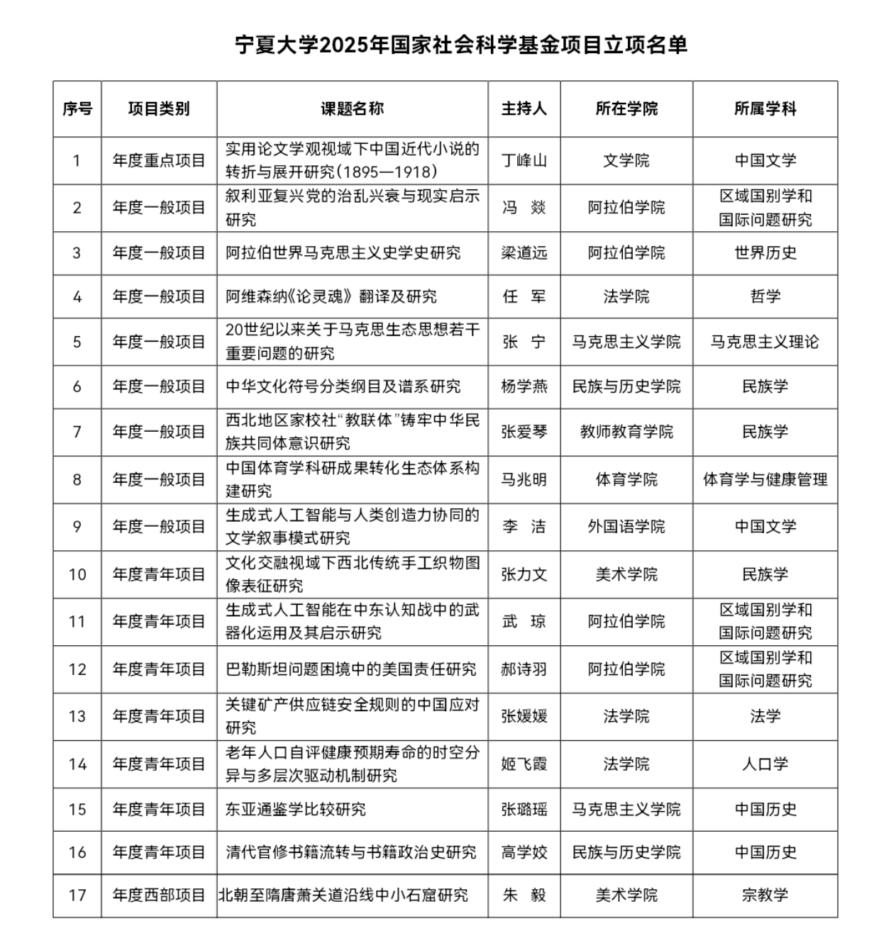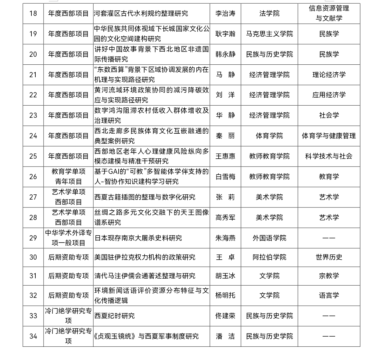【永利集团304官网新闻中心讯 人文社会科学处】近日,随着2025年国家社科基金冷门绝学研究专项立项名单公示,永利2025年国家社科基金立项数达到34项(其中重点项目3项),占全区立项总数近60%,取得历史性突破。其中,国家社科基金年度项目获批25项、艺术学单项获批2项、教育学单项获批1项,在Z14高校中位居第4名,在全国高校中位居第51名。另外,国家社科基金后期资助专项获批3项,中华学术外译专项获批1项、冷门绝学研究专项立项2项,实现稳步增长态势。