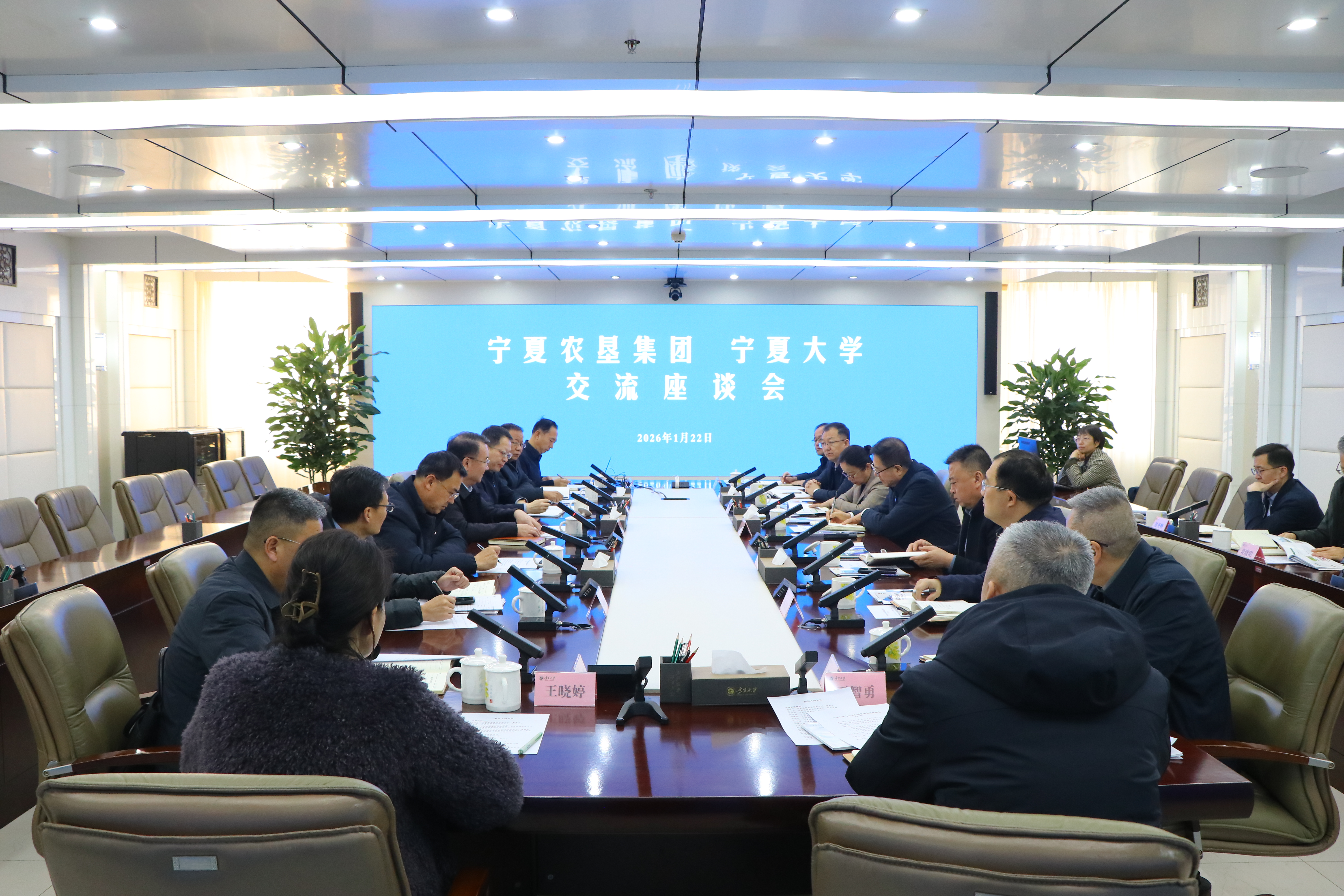 【永利集团304官网新闻中心讯 杨雯/文、图】1月22日,永利集团304官网与宁夏农垦集团召开交流座谈会。宁夏农垦集团党委书记、董事长潘建宁,校党委书记王宏伟,党委副书记张桓,副校长赵晓佳,校党委常委、副校长杨文法参加座谈会。王宏伟主持会议。