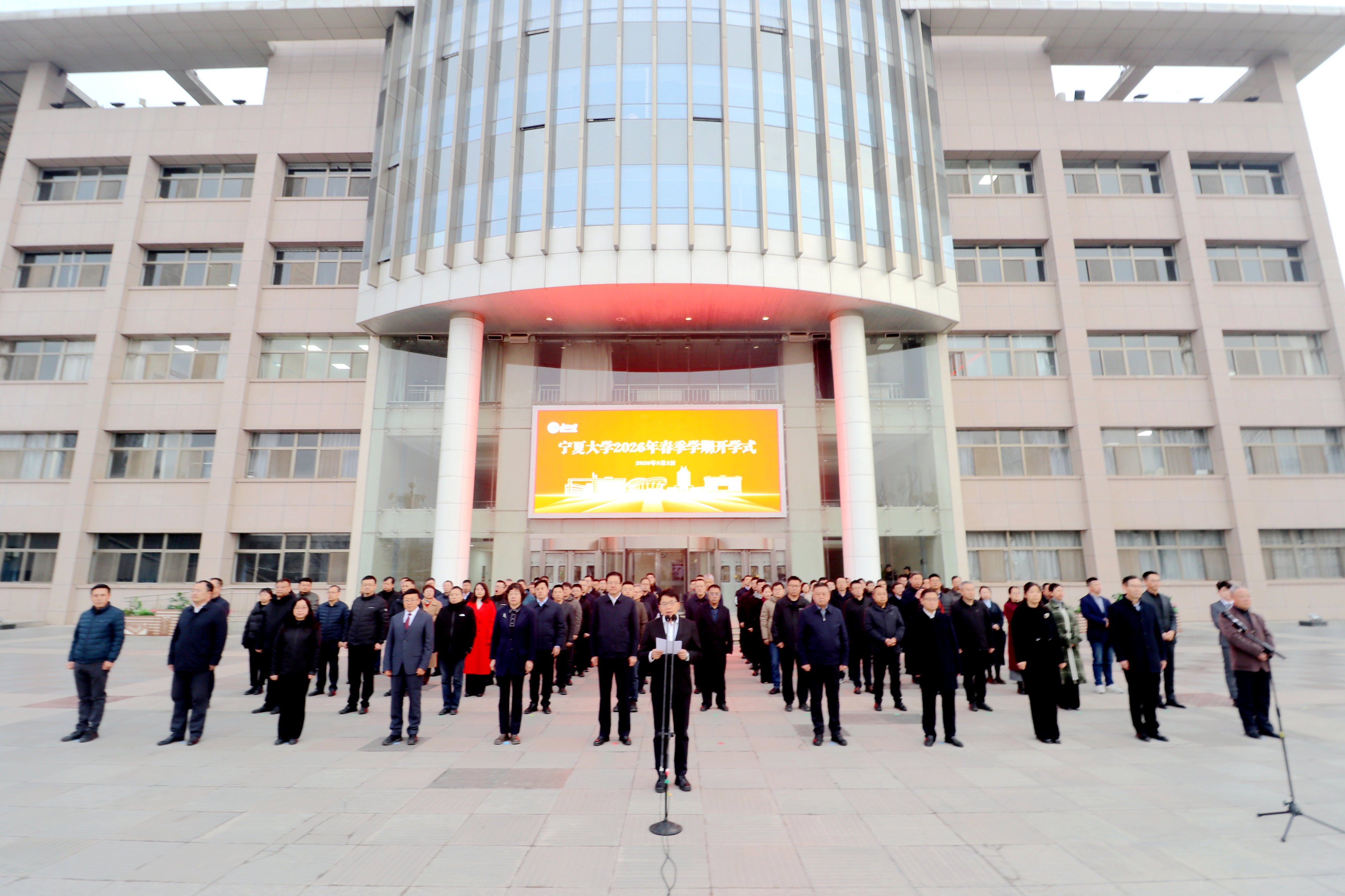 【永利集团304官网新闻中心讯 王文娣/文 张景 李明花/图】3月2日清晨,永利在贺兰山校区德勤楼前举行2026年春季学期开学式。全体校领导参加活动,校党委副书记、校长彭志科主持仪式。