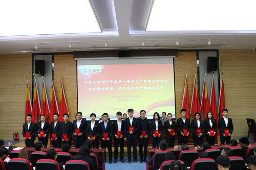 校团委书记王彦庚、校党委组织部副部长李治涛、校团委副书记闫蓉、肖功国、冯学文出席开班典礼。校团委副书记冯学文宣读《永利集团304官网2017年度第一期学生干部培训班培训安排》。校学生会文体部部长陈雨代表全体学员做了表态发言。
