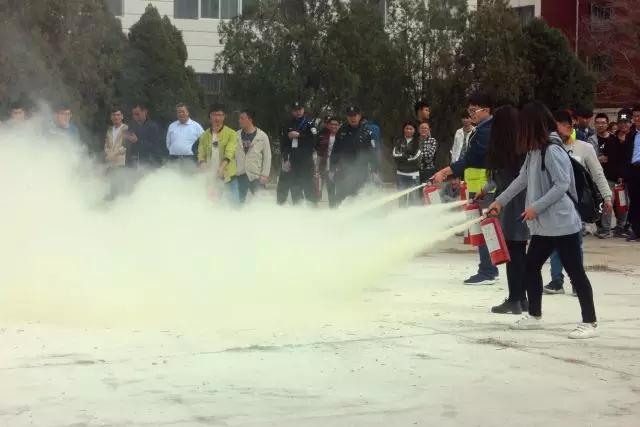 最后,北京央务恒远保安服务公司的保安讲解示范了灭火器的使用方法,并指导师生实践操作使用灭火器灭火。