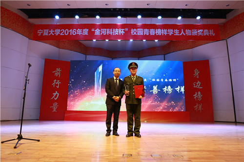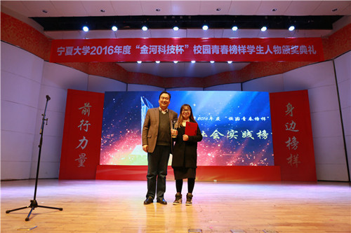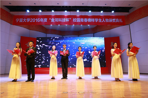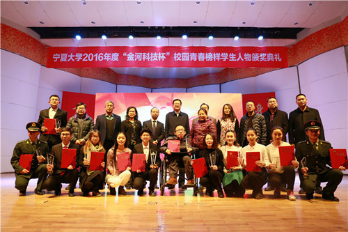 【永利集团304官网新闻中心讯 团委】12月14日晚,由校团委主办,校学生会承办的2016年度“金河科技杯”校园青春榜样学生人物颁奖典礼在贺兰山校区音乐厅举行。校党委副书记王宏伟、宁夏金河科技股份有限公司副总经理李锐、永利集团304官网“两节”组委会各成员单位及相关部门负责人出席本次活动并担任颁奖嘉宾。