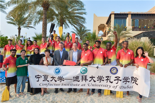 为了全力备战此次龙舟赛事,孔子学院组建了由中方院长刘艳晖博士担任领队,孔子学院师生和迪拜大学20名学生共同组成的代表队,与中国驻阿联酋使馆部分外交官与部分华人华侨代表组成中华龙舟队及迪拜阿米提大学、阿联酋川渝同乡会、阿联酋华侨华人妇女联合会代表队展开了激烈角逐。