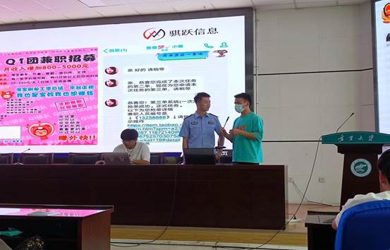 活动现场,主讲警官从什么是电信网络诈骗、常见及高发电诈骗局案例、刷单贷款沉浸式体验以及断卡行动等方面向同学们进行了反诈宣讲,在应用技术手段现场邀请学生上台互动环节,民警向同学们生动形象的展示了电信网络诈骗发生发展真实过程,深刻揭露了网络兼职刷单、套路贷等诈骗手段。