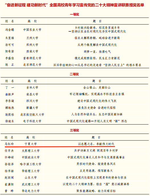 【永利集团304官网新闻中心讯 校团委】近日,由清华大学举办的“奋力新征程 建功新时代”全国高校青年学习宣传贯彻党的二十大精神宣讲联赛获奖名单公布,永利“宁育菁华”青年宣讲团成员、马克思主义学院研究生马红玲所作“以志愿之名,奉献伟大时代”的主题宣讲喜获三等奖。