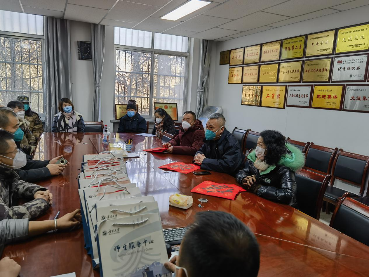 1月15日,校工会委托保卫处领导对值守护校一线的安保人员进行了看望慰问,并向他们赠送了节日大礼包、春联等物品,充分肯定他们在维护学校安全稳定发展中做出的贡献,希望大家节日期间继续尽职尽责为建设平安、文明校园贡献力量。