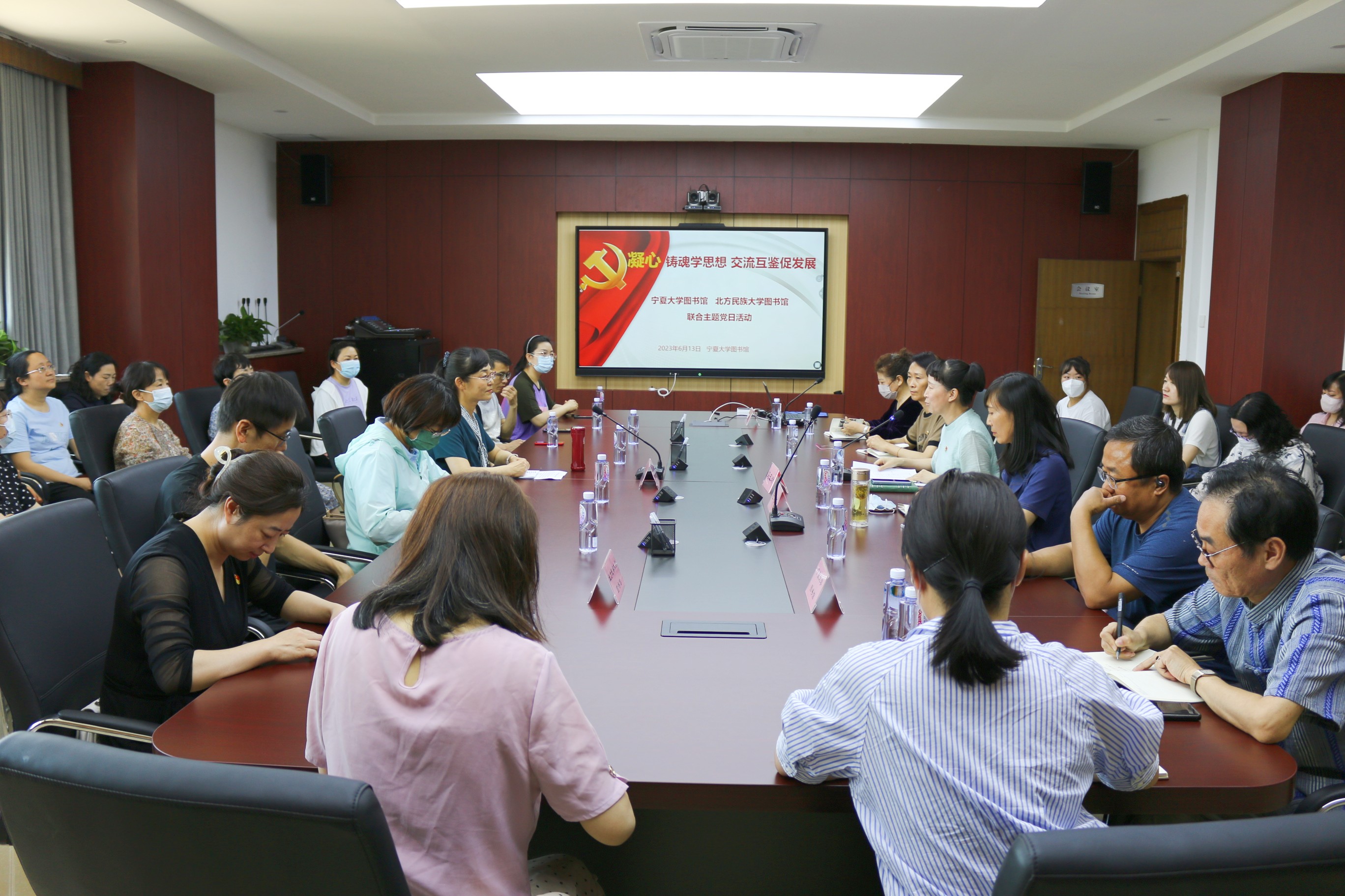 【永利集团304官网新闻中心讯 图书馆】为推动学习贯彻习近平新时代中国特色社会主义思想主题教育走深走实,落实“学思想,强党性,重实践,建新功”的总体目标,6月13日,永利集团304官网图书馆与北方民族大学图书馆联合开展“凝心铸魂学思想 交流互鉴促发展”主题党日活动,两馆领导班子成员、部门负责人与全体党员参加此次主题党日活动。