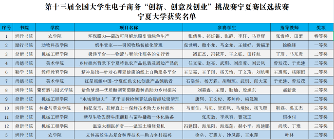 经过激烈的比拼,润泽书院的《环保膜力—菌改可降解地膜引领绿色生产》项目荣获特等奖;励行书院的《奶牛管家—引领牧场智能化管理》项目荣获一等奖,鼎新书院的《极递平台—物流与智能化服务的先行者》等3个项目荣获二等奖,尚德书院的《红星照耀中国-宁夏红色文化创意产品领航者》等7个项目荣获三等奖。