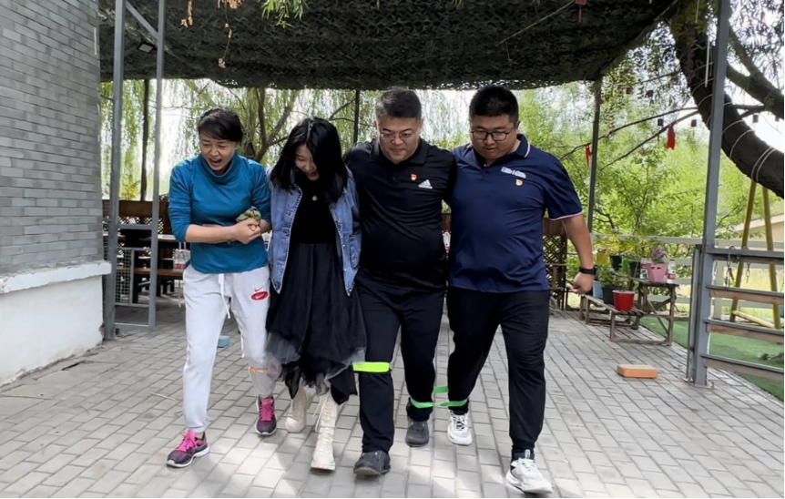 最后,全体教职工分为两组:“创新蛟龙队”和“创业猛虎队”,先后开展了角力拔河、集体跳绳、四人五足、摸石过河等“龙争虎斗素拓PK”系列素拓活动,整个活动最终在友好竞争和欢声笑语中结束。
