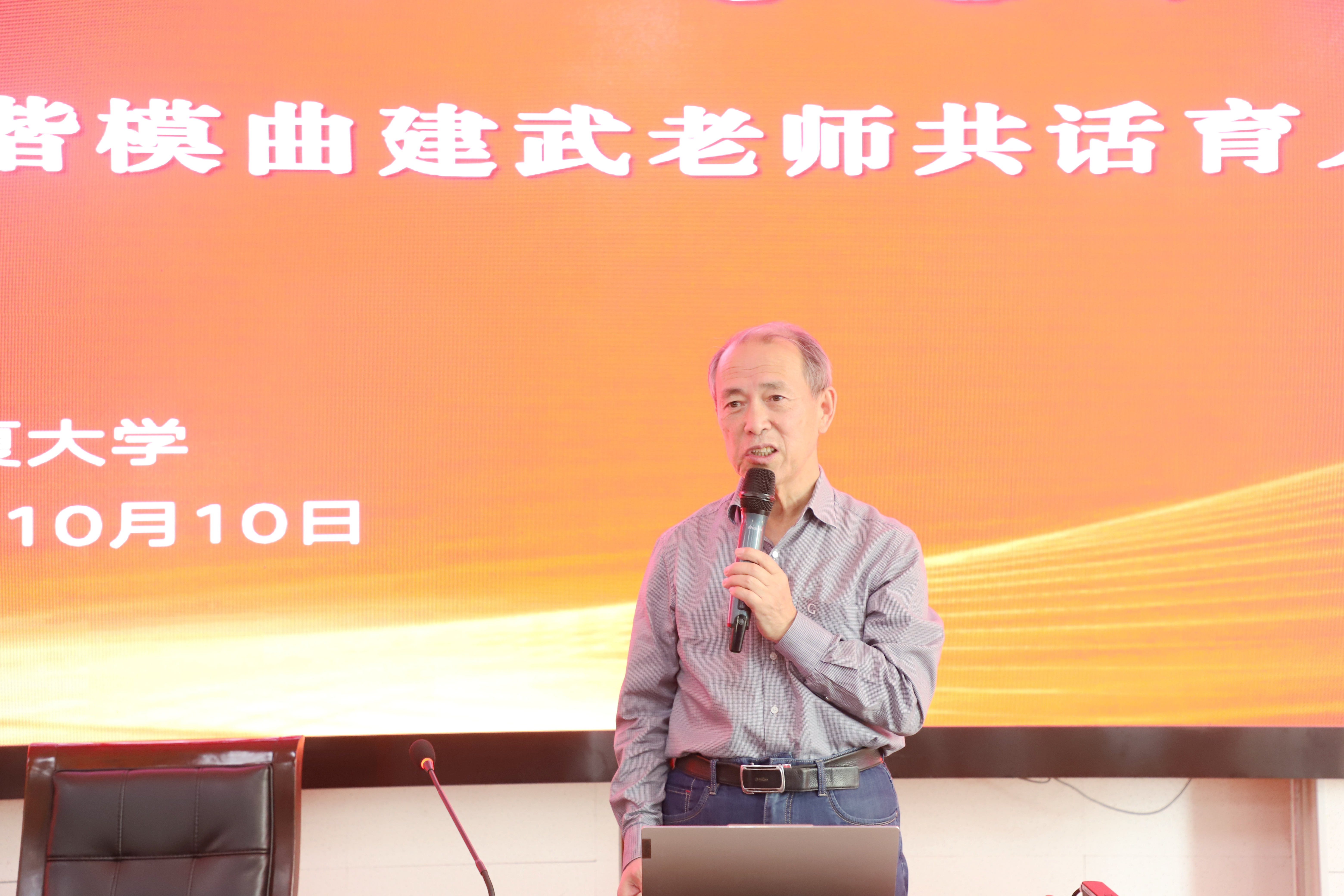 讲座中,曲建武以《涵养崇高师德 倾力铸魂育人》为主题,进行专题讲座。围绕传承先进文化、坚定理想信念、工作脚踏实地、激励学生为祖国而学习、关心学生生活等八个方面,结合自己担任高校辅导员数十年的经历与感悟,通过一张张暖心感人的照片、一封封情真意切的书信、一次次不求回报的帮扶、一段段诲人不倦的故事,展现了他心系国家、爱生如子的高尚情操和对教育事业的岁月坚守与执着追求,诠释了作为高校辅导员如何践行自己的初心和使命,帮助青年学生“扣好人生第一粒扣子”,引导大学生健康成长。