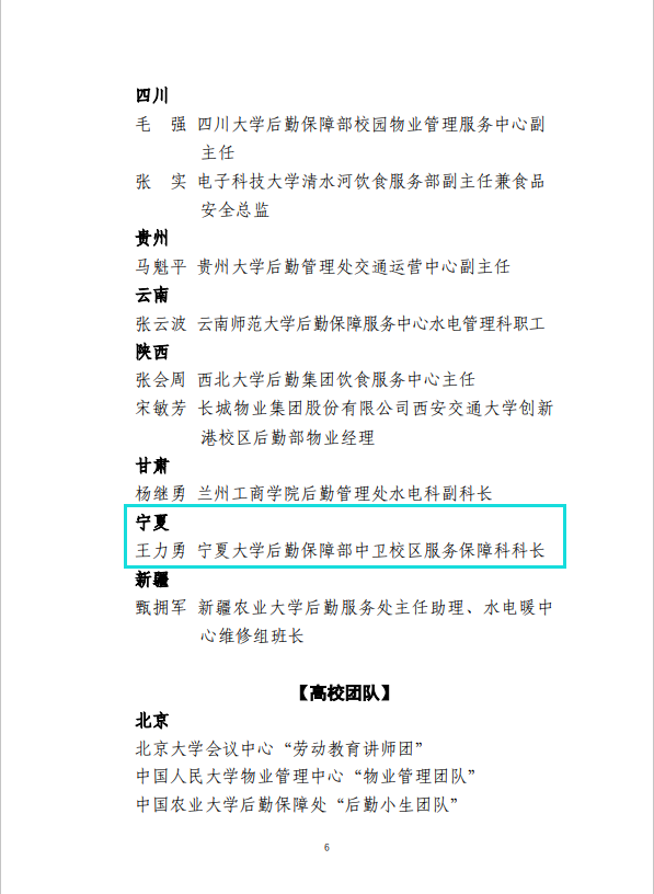 【永利集团304官网新闻中心讯 后勤保障部】近日,在中国教育后勤协会开展的以“新时代新奉献”为主题的“最美后勤人”推举活动中,永利后勤保障部中卫校区服务保障科科长王力勇同志从全国277所高校和中小学后勤的347份申报材料中脱颖而出,与全国高校领域的49位后勤同仁共同获评全国“最美后勤人”荣誉称号。