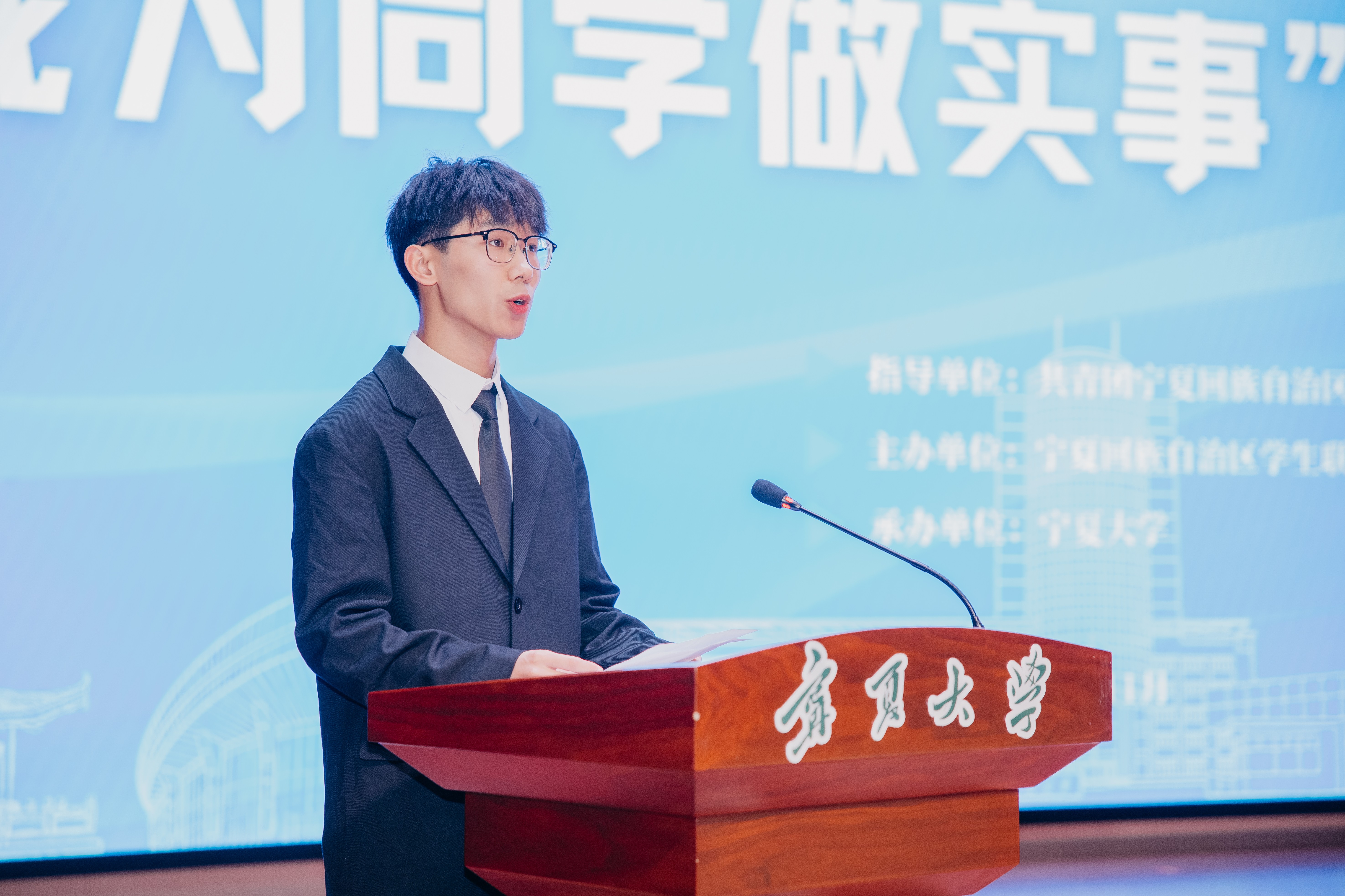 宁夏学联主席兰鑫代表宁夏学联发言,强调学生工作中需增强政治站位、聚焦专业引领,积极回应同学期盼,丰富课余生活。宁夏医科大学杨修龙作为参赛学生代表号召全体学生会组织加强自我建设,更好服务同学。