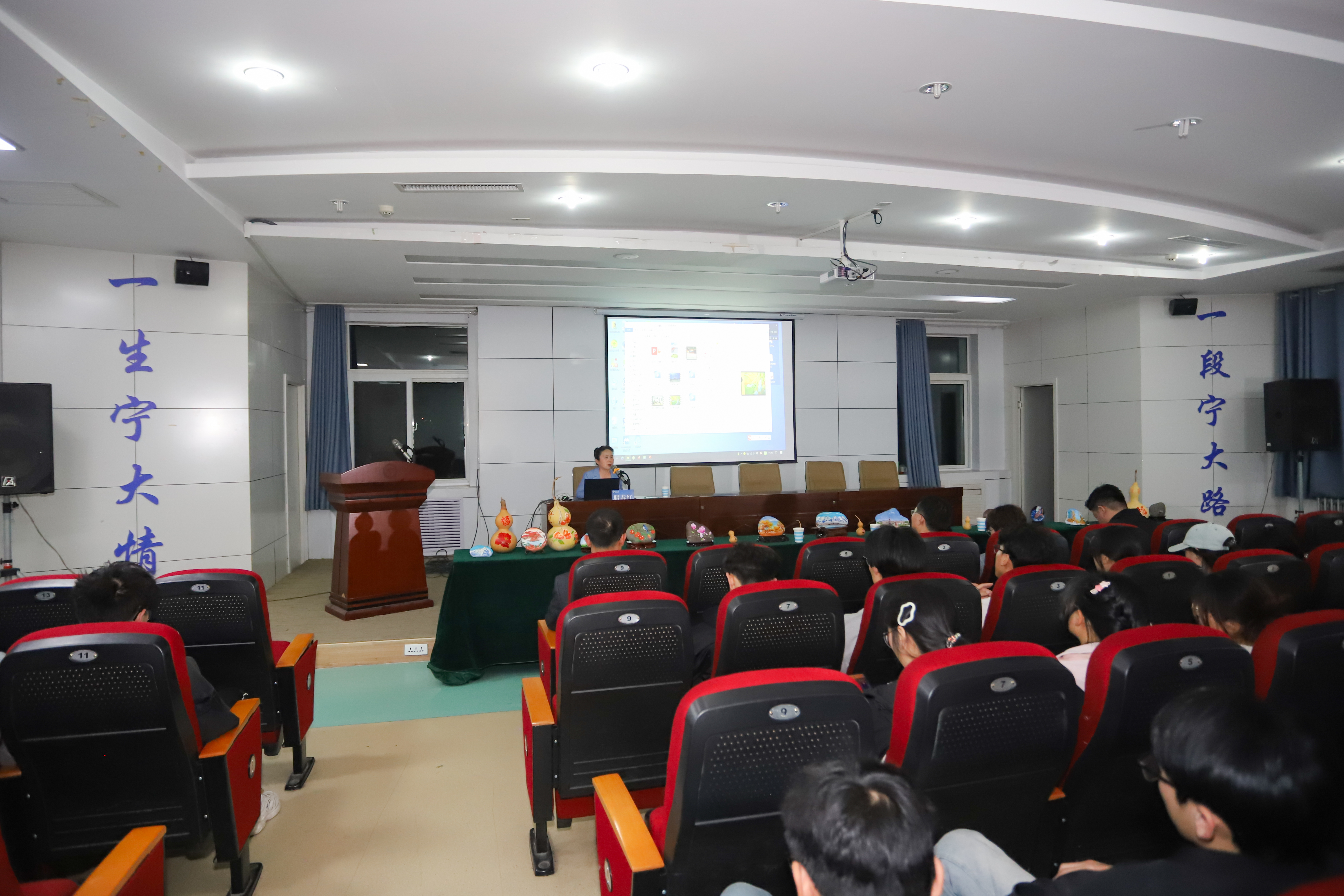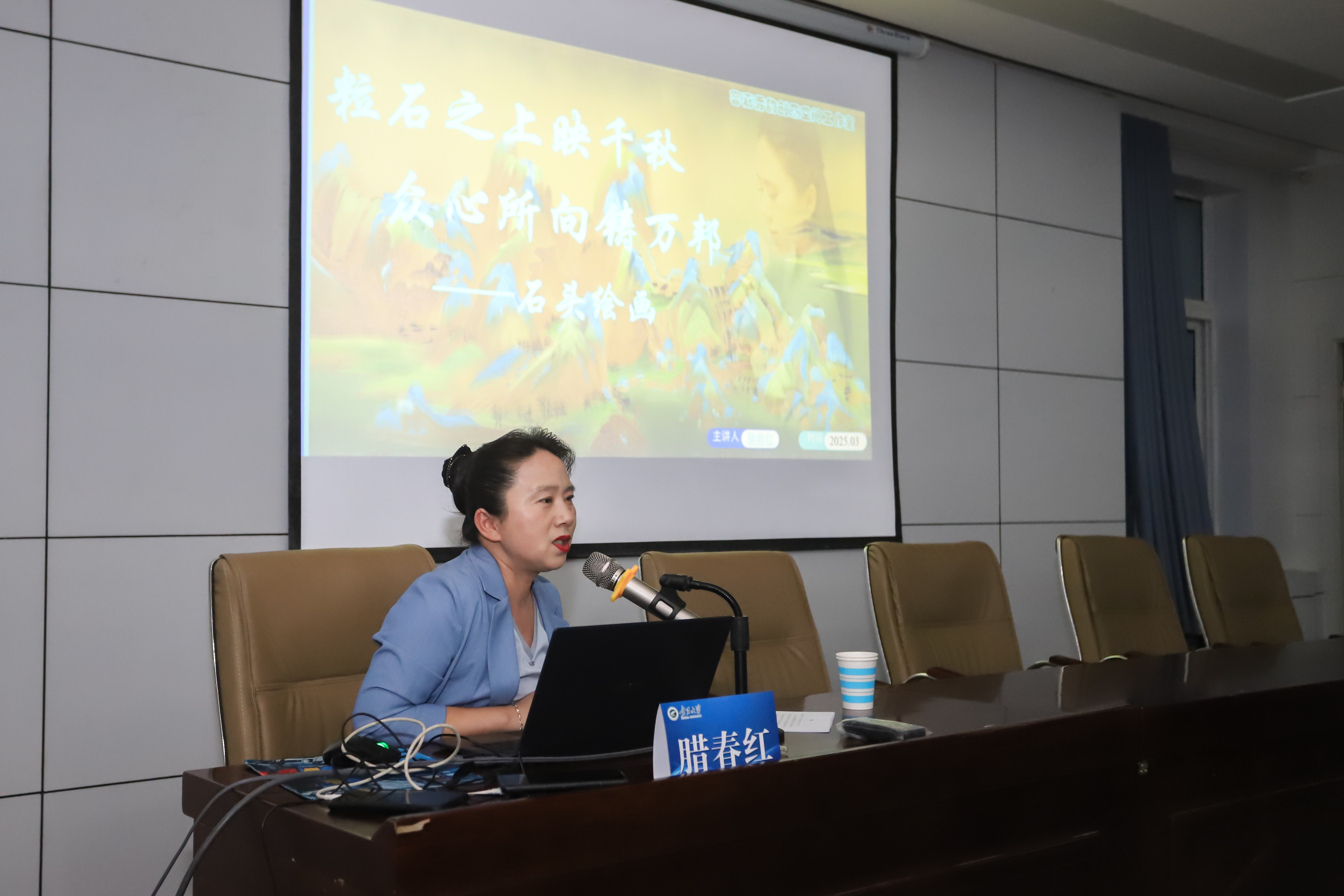 讲座结束,腊春红为在场师生讲解自己创作的石头绘画作品。