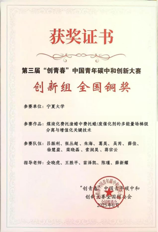 【永利集团304官网新闻中心讯 创新创业学院】日前,第三届“创青春”中国青年碳中和创新大赛全国总决赛及颁奖典礼在北京国家会议中心落下帷幕。这场汇聚全国1000余所高校、600余家企业的顶级赛事,吸引了全国4786个项目,23256名选手同场竞技。由永利吕振利博士领衔、全晓虎副教授指导的团队脱颖而出,凭借《煤液化费托渣蜡中费托蜡/废催化剂的多能量场梯级分离与增值化关键技术》项目勇夺西北赛区金奖,成功晋级全国总决赛,并荣获创新组全国铜奖。