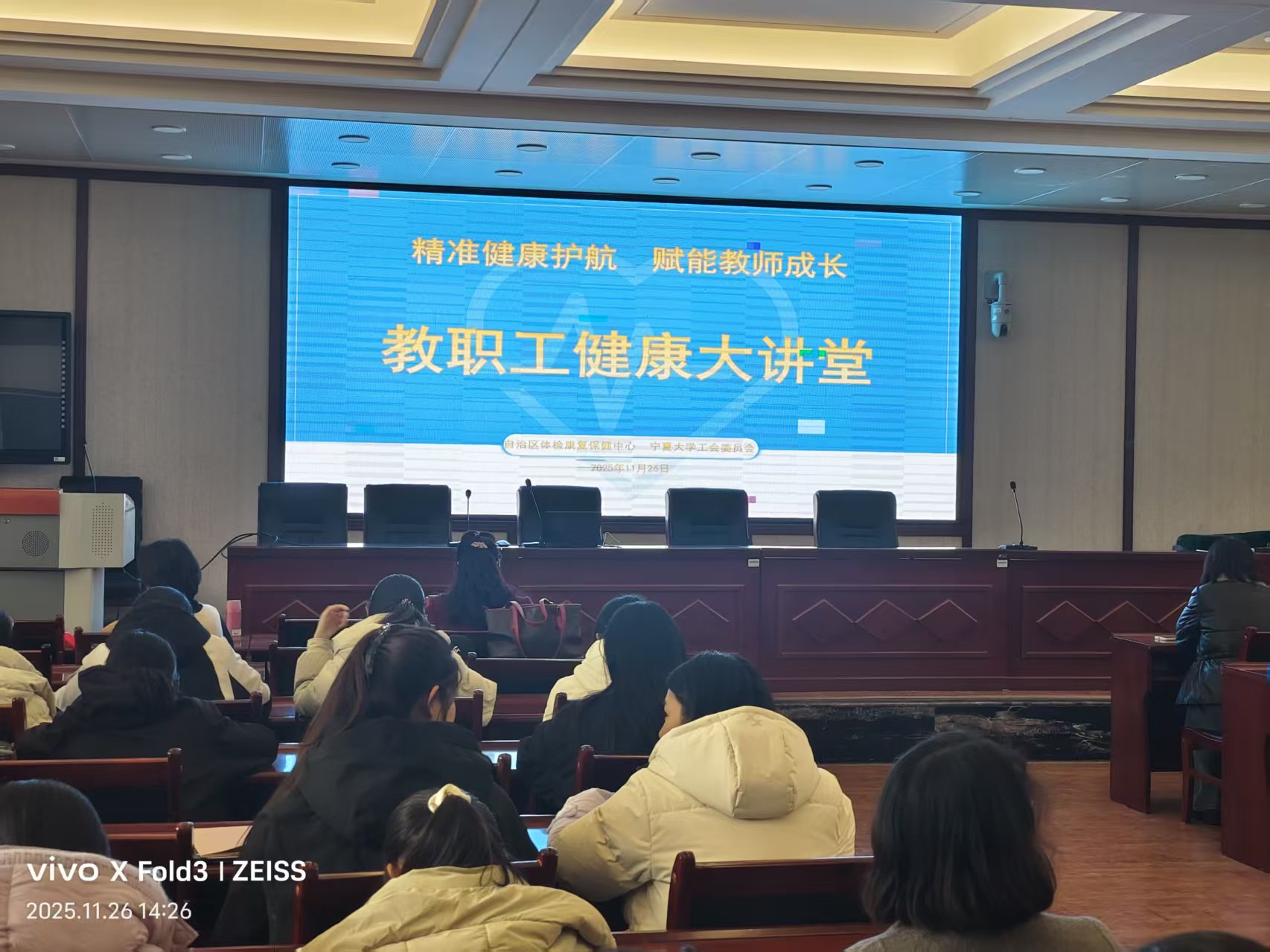 【永利集团304官网新闻中心讯 校工会】为依托自治区体检康复保健中心的专业资源优势,为教职工提供精准、权威的健康指导,11月26日,校工会联合自治区体检康复保健中心在怀远校区举办教职工健康宣讲活动,我区医疗专家受邀为教职工讲授健康管理知识和女性保健知识,校工会常务副主席牛建军参加活动,校工会副主席王红枫主持活动。