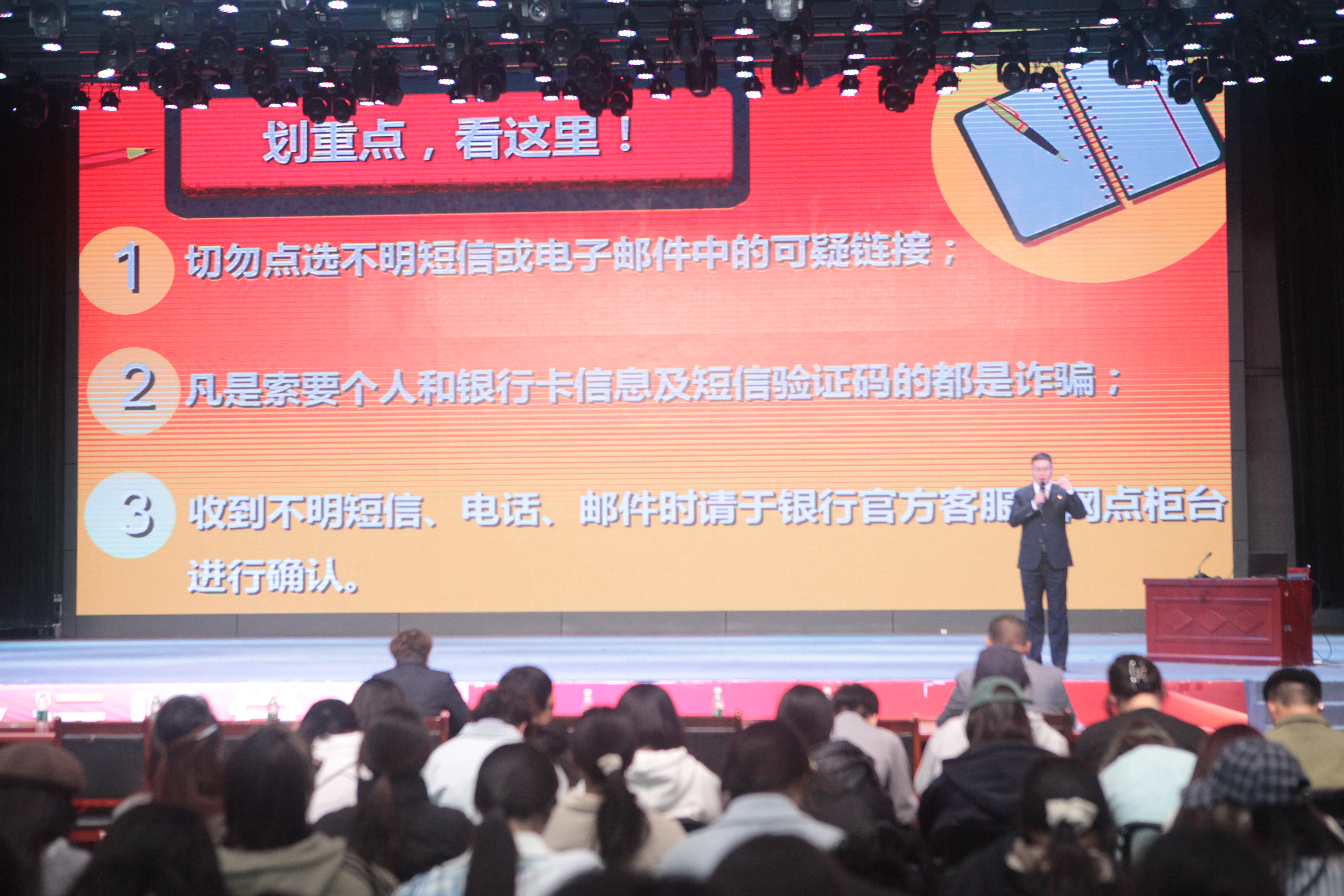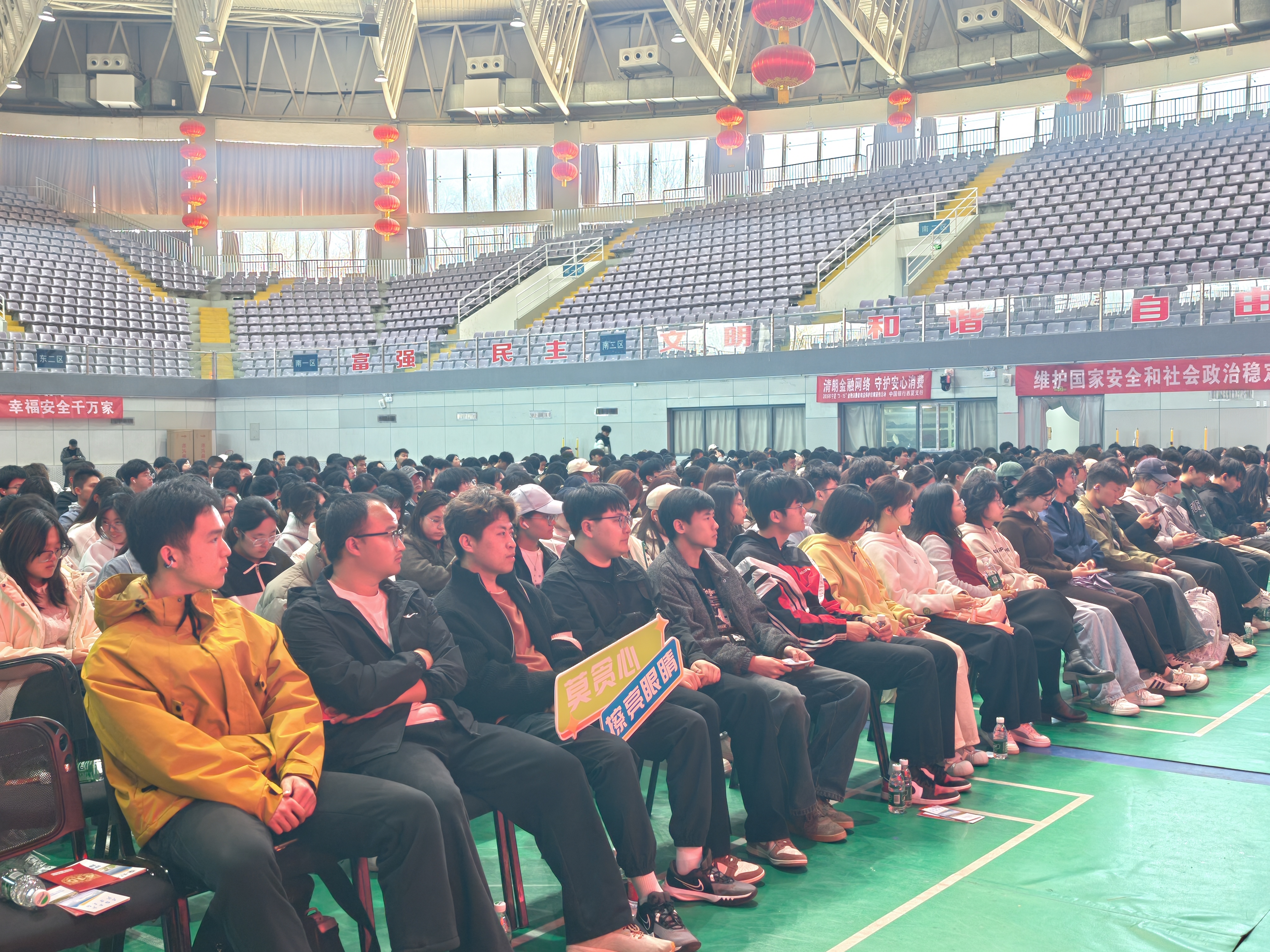 在专题讲座环节,保卫处副处长桂晓兵系统解读了校园安全管理体系,重点围绕国家安全、意识形态安全、交通安全、消防安全、禁毒安全教育等领域展开宣讲。中国银行银川怀远西路支行副行长王传亮以“晴朗金融网络 守护安心消费”为主题,结合“校园贷”“网络投资”“冒充客服”“租借银行卡”等典型骗局,传授防诈识骗技巧。活动还特别设置互动问答环节,通过有奖竞答等形式,激发师生参与热情,现场气氛热烈。