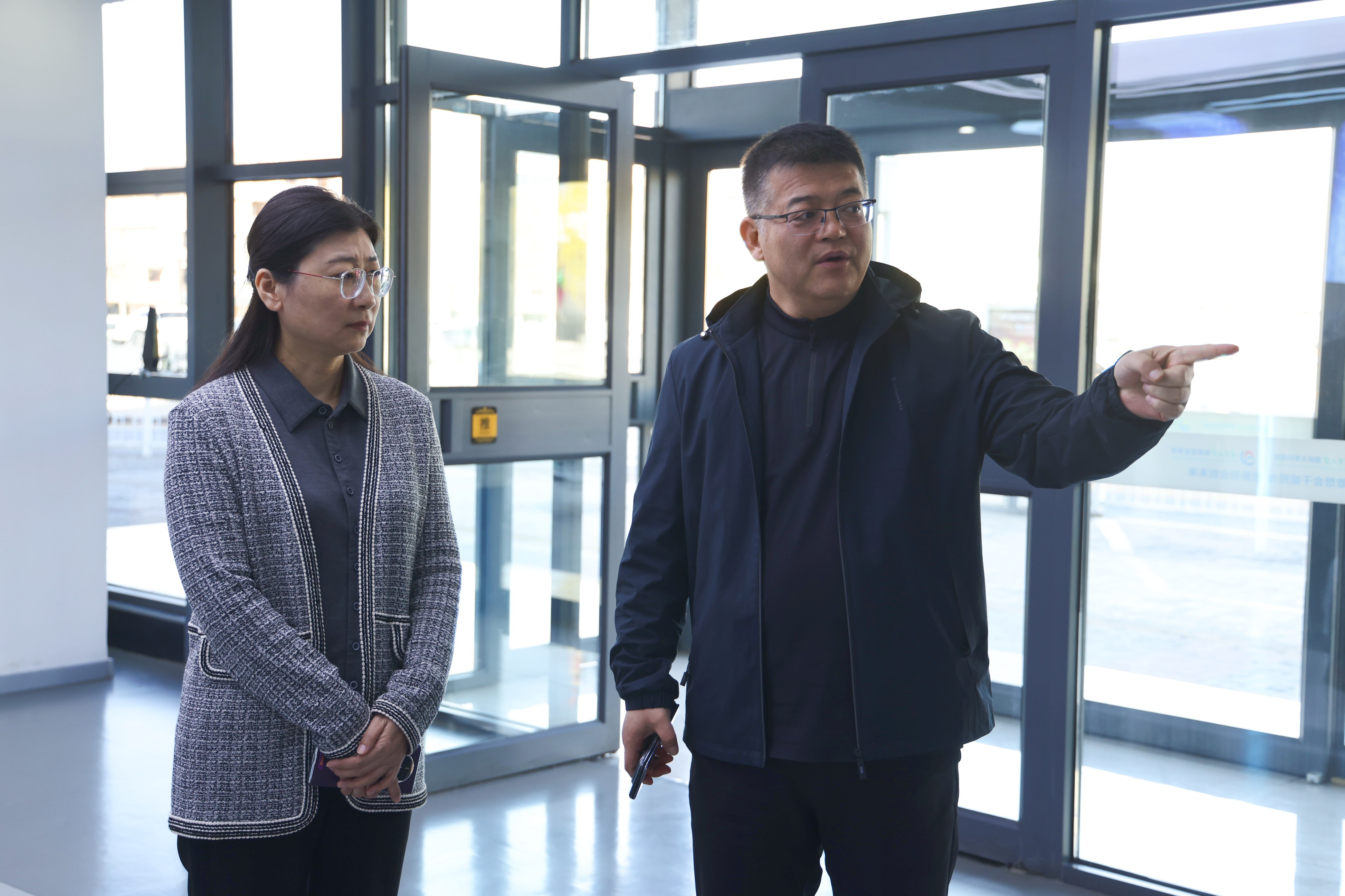 王震一行实地参观了园区数字化展厅、数字化模拟实验室、创客咖啡、创客书吧及入孵企业宁夏极客空间建筑科技有限公司,重点介绍了创新创业学院在文化体系建设、创新创业教育实践基地建设、科技成果转化及科技企业孵化等方面取得的成果。工作人员现场演示了校企合作项目“智慧景区数字化营销系统”与“智慧景区综管管控平台”,并介绍了入孵企业的核心产品,包括极客空间以废弃葡萄藤为原料制作的葡藤板、山海开明智能装备研发的智能安防设备,以及参宿文化、墨谷科技等公司开发的各类数字文创产品,充分体现了园区在企业孵化与成果转化方面的扎实成效。