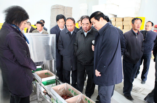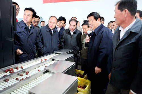 在灵武果业公司车间,与会人员现场查看了红枣自动化无损检测分选机应用情况。听取了项目主持人何建国教授关于设备使用情况的介绍。观摩中,与会人员分别从各自角度对红枣自动化无损检测分选机给予高度评价。