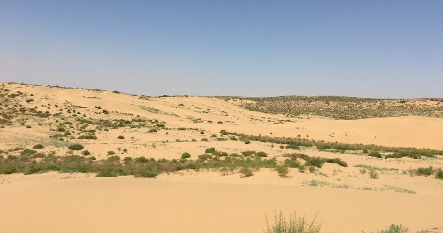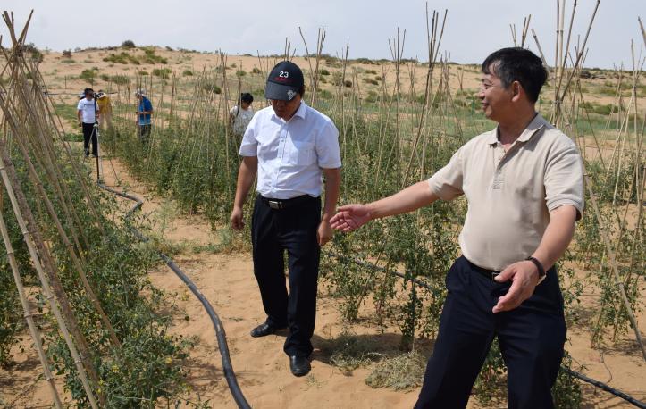 由赵玉芬院士带队的专家组驱车走进位于内蒙古阿拉善乌斯泰镇的乌兰布和沙漠腹地,正当大家被一路荒凉、寂寥的视野搞得困意恹恹时,车停在了在一块南北长条形的沙坡边。顺着内蒙古阿拉善盟乌兰布和沙漠生态产业示范园区党工委副书记、副主任田学文手指的方向,一片明亮如绿宝石的“植被”让大家睁大了眼睛。