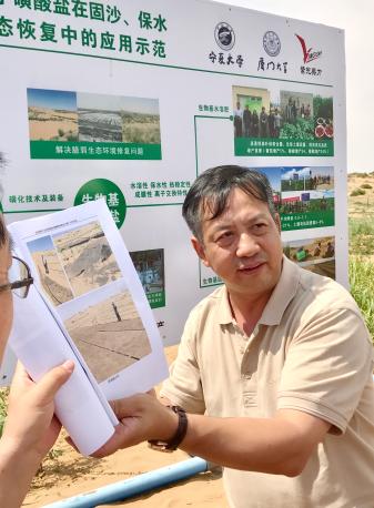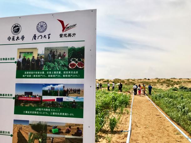 示范田里“永利集团304官网与厦门大学合作的科研项目介绍牌”如田埂上的一棵树,非常引人注目,项目名称“多功能水溶性生物基高分子磺盐酸在固沙、保水、供肥以及沙漠和盐碱地生态恢复中的应用示范”特别醒目。