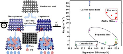 该研究发展了一种简单制备高度致密的ZIF-8/不锈钢网复合膜(ZFCM)的方法,通过改变晶化时间可对膜的分离孔径进行有效调控;研究结果首次发现并证实ZIF-8膜具有在空气中疏水(空气中水的接触角为105.5°)在水下接近超疏油(水下环己烷的接触角为145°)的特性。经水预先润湿的ZFCM,可以利用自身重力作用,实现各类油/水混合物的高效分离:在油的分离选择性高于99.9%条件下,水的渗透通量高达50 L m-2s-1,且经10次循环使用后油水分离效果并未降低。因此,该膜材料具有优异的水溶液稳定性和分离稳定性。