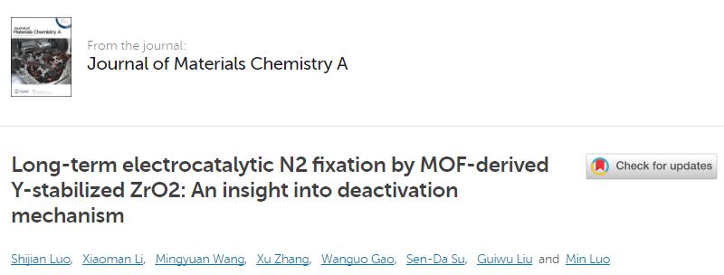 【永利集团304官网新闻中心讯 化学化工学院】近日,永利化学化工学院(省部共建煤炭高效利用与绿色化工国家重点实验室)罗民教授负责的能源与环境材料研究团队,在电催化固氮研究方面取得重要进展。研究成果在线发表在英国皇家化学学会RSC数据库国际著名学术期刊《Journal of Materials Chemistry A》(Impact Factor 2018: 10.733)。论文题目:“Long-term electrocatalytic N2fixation by MOF-derived Y-stabilized ZrO2: An insight into deactivation mechanism”;DOI:10.1039/D0TA01154A。化学化工学院省部共建煤炭高效利用与绿色化工国家重点实验室为第一通讯单位,能源与环境材料研究团队的罗民教授、李晓曼讲师与江苏大学材料学院刘桂武教授为本文的通讯作者,2017级应用化学专业硕士生骆诗剑同学为论文第一作者。