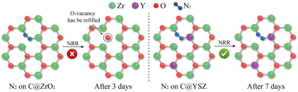 本文以廉价且易制备的金属有机框架材料(UiO-66)为前驱体,通过原子掺杂引入Y3+,再经一步热处理,制备了碳包覆钇稳定氧化锆(C@YSZ)与碳包覆氧化锆(C@ZrO2)催化剂。两种催化剂均能高效催化电化学固氮反应(NRR),实验表明催化剂表面的氧空位是氮还原的主要活性位点。此外,C@YSZ表现出长达7天的超长寿命,是目前NRR领域使用寿命最长的催化剂,而C@ZrO2工作3天后即失活。本文通过密度泛函理论计算(DFT)与纳克级质量敏感的原位电化学石英晶体微天平(EQCM)证明了这两种催化剂使用寿命不同的直接原因是其表面氧空位的稳定性不同。本研究详细讨论并首次提出了电催化固氮过程中氧空位的作用与失活机制,对于固氮电催化剂的设计提供了理论依据和设计原则。