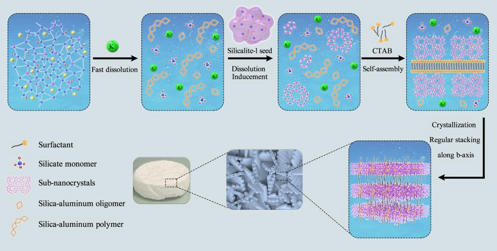 纳米片层结构ZSM-5分子筛,具有稳定的Si-O-Al和Si-O-Si键、独特的准二维结构、有序的微孔-介孔特征、适宜的表面酸性和良好的扩散性能,是分子筛催化剂研究领域的前沿热点。目前合成纳米片层结构ZSM-5分子筛都采用实验室自合成的双头或多头长链季铵盐作为结构导向剂,合成步骤复杂且价格昂贵,因而限制了纳米片层结构ZSM-5分子筛催化剂的工业应用。